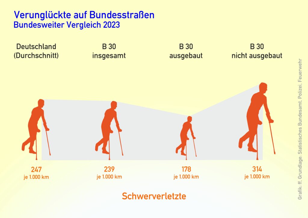 Die Gefahr, auf der B30 schwer verletzt zu werden im Vergleich zum Bundesdurchschnitt. Grafik. Franz Fischer (Initiative B30).
