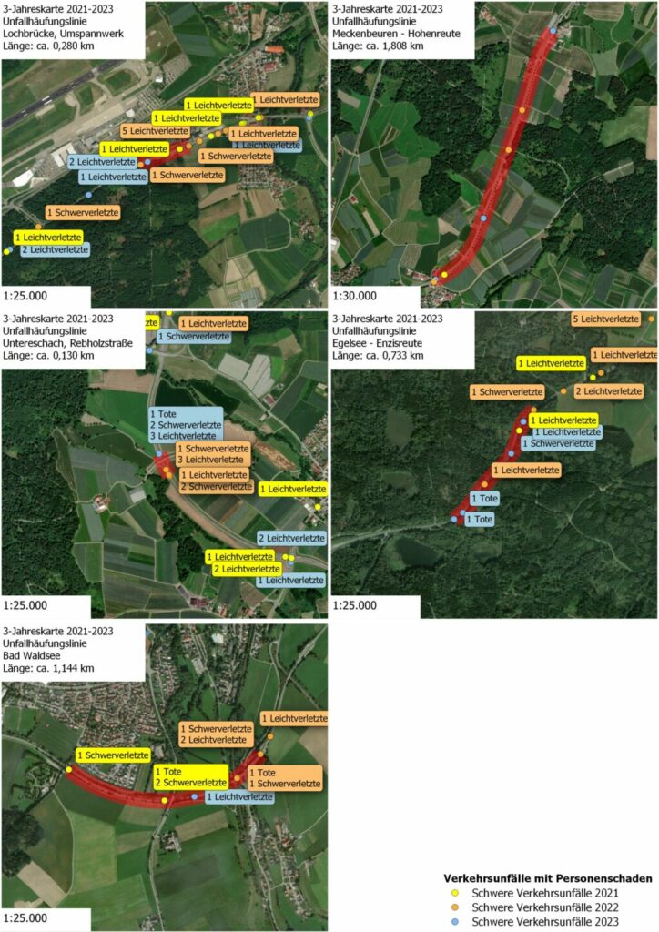 Bad Waldsee (rei) – 269 Verkehrsunfälle ereigneten sich im vergangenen Jahr (2023) auf der B30 zwischen Um und Friedrichshafen laut Berichten von Polizei und Feuerwehr. Dabei verunglückten 160 Menschen: Vier verstarben, 24 wurden schwer und 132 leicht verletzt. Mindestens 392 Fahrzeuge waren beteiligt. Bei 130 Unfällen entstand Sachschaden von insgesamt rund 2,1 Millionen Euro. Zu 139 Unfällen liegen keine ausreichenden Daten über die Schadenshöhe vor. Der volkswirtschaftliche Schaden bekannt gewordener Verkehrsunfälle beträgt nach den Unfallkostensätzen der Bundesanstalt für Straßenwesen ca. 9,9 Millionen Euro. Diese Bilanz zieht Franz Fischer von der in Gaisbeuren ansässigen „Initiative B30“ gemäß der Datenlage des Statistischen Bundesamtes und des Unfallatlasses.