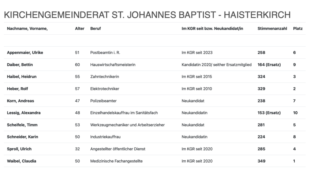 In der Kirchengemeinde St. Johannes Baptist Haisterkirch lag die Wahlbeteiligung bei 43,87 Prozent (2020: 43,61 Prozent). Die Zahl der Wahlberechtigten betrug 864 Personen. 10 Frauen und Männer hatten für 8 Ratssitze kandidiert. Im Durchschnitt sind die gewählten Vertreterinnen und Vertreter 49 Jahre alt. 4 Kirchengemeinderäte kamen am Wochenende neu ins Amt. Die meisten Stimmen erhielt Claudia Waibel. Gewählte Kandidatinnen und Kandidaten und Ersatzbewerber, die von Beginn zur Mitwirkung im KGR beratend eingeladen sind: