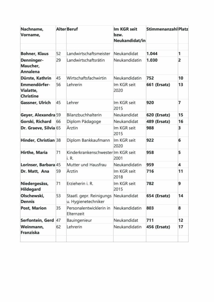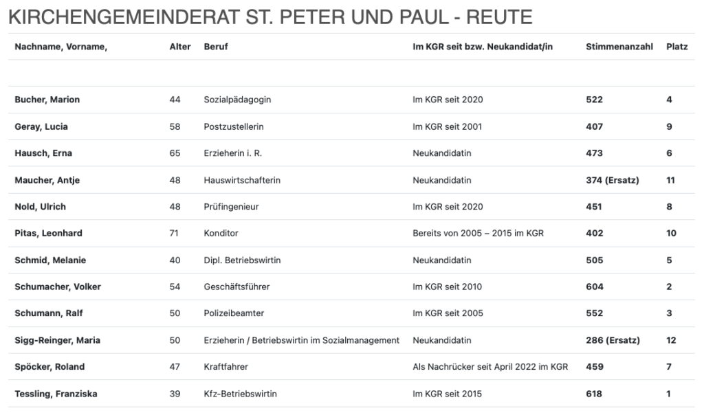 In der Kirchengemeinde St. Peter und Paul Reute lag die Wahlbeteiligung bei 35,27 Prozent (2020: 31,21 Prozent). Die Zahl der Wahlberechtigten betrug 2112 Personen. 12 Frauen und Männer hatten für 10 Ratssitze kandidiert. Im Durchschnitt sind die gewählten Vertreterinnen und Vertreter 51 Jahre alt. 3 Kirchengemeinderäte kamen am Wochenende neu ins Amt. Die meisten Stimmen erhielt Franziska Tessling. Gewählte Kandidatinnen und Kandidaten und Ersatzbewerber, die von Beginn zur Mitwirkung im KGR beratend eingeladen sind:
