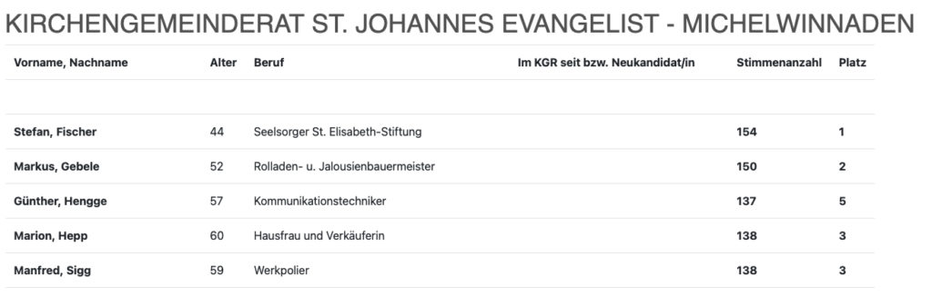 In der Kirchengemeinde St.Johannes Evangelist Michelwinnaden lag die Wahlbeteiligung bei 38,77 Prozent (2020: 46,92 Prozent). Die Zahl der Wahlberechtigten betrug 423 Personen. 5 Frauen und Männer hatten für 5 Ratssitze kandidiert. Im Durchschnitt sind die gewählten Vertreterinnen und Vertreter 54 Jahre alt. 3 Kirchengemeinderäte kamen am Wochenende neu ins Amt. Die meisten Stimmen erhielt Stefan Fischer. Die gewählten Kandidatinnen und Kandidaten: