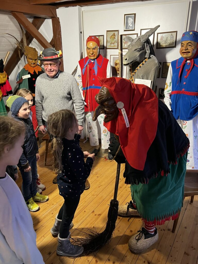 So hat unser Eugen-Bolz-Kindergarten das Fasnetsmuseum der Narrenzunft Bad Waldsee besucht und dort Allerlei über die Masken der Waldseer Fasnet gelernt. Bei einem vorgezogenen Wächsebrauch fielen dann eine beachtliche Menge Süßigkeiten vom Himmel.