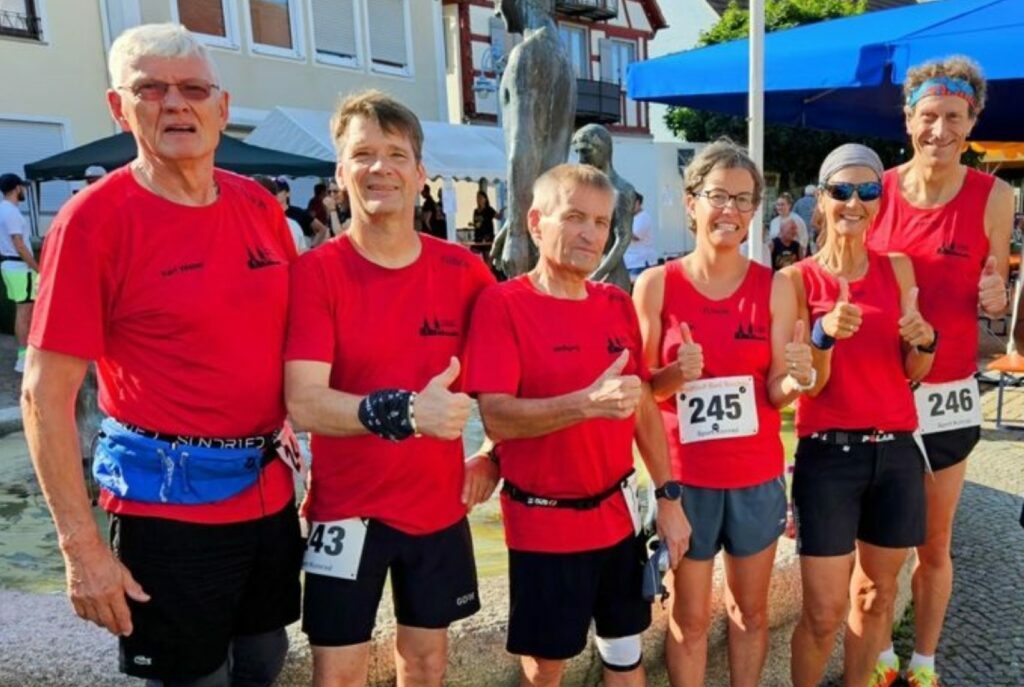 Trotz der prallen Sonne sorgten die Bad Waldseer für eine Novität. Alle 5 Starter fanden sich bei der Siegerehrung auf dem Treppchen. Frank Dargel mit 1:39:06 Std. AK55 Platz 1. Wolfgang Greshake, 1:47:19 Std. AK65 Pl. 1. Kerstin Schwarz, 1:53:32 Std. AK45 Pl. 2. Richard Köberle, 1:59:41 Std. AK60 Pl. 3 und Karl Weber AK75, Platz 2. Aus Zeitmangel absolvierte Beate Bell nur den kurzen 5 KM Lauf. Trotz des späten Starts um 11.00 Uhr und unter voll Sonne kam sie schon nach 23:38 Min. als 5. Frau von 37 ins Ziel. Alle waren sich einig, in 2025 werden sie alle wieder beim Federseelauf dabei sein.
