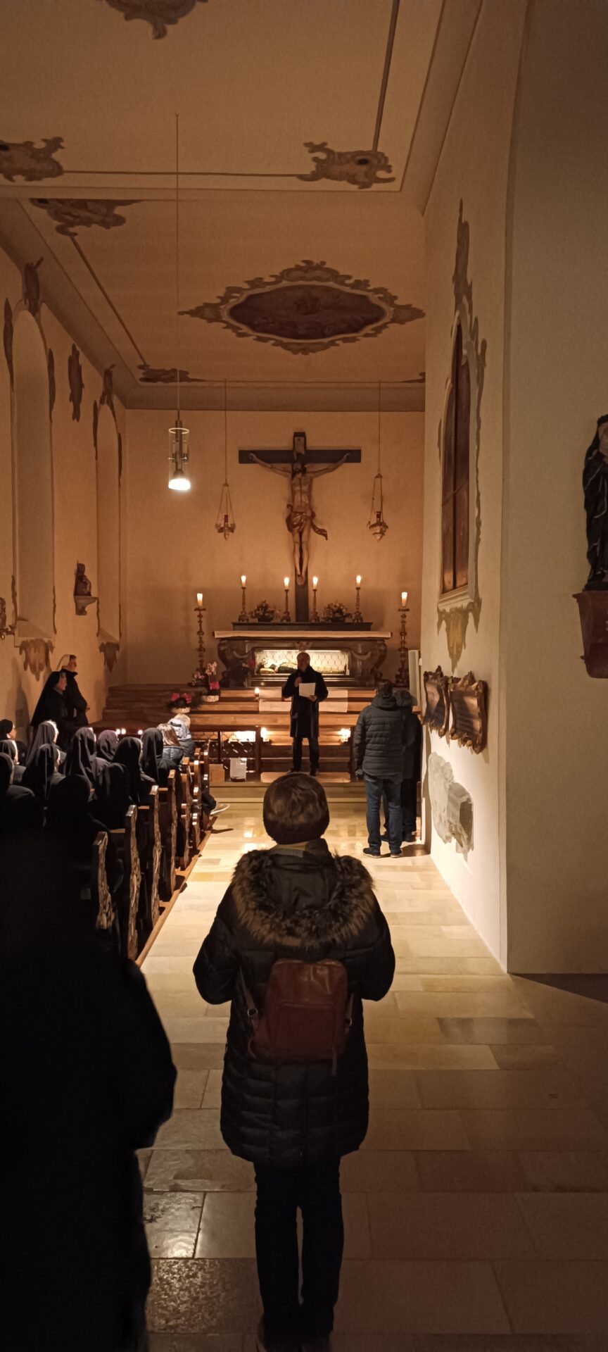 Schwester Birgitta nahm hier nochmals Bezug auf die gemeinsam von Kloster und Seelsorgeeinheit Bad Waldsee ausgerichteten fünf Pilger-Samstage zu Orten der Menschlichkeit. Im Gedenken und Solidarität zündete sie jeweils eine Kerze an. Singend und betend ging es anschließend in Richtung Klosterberg. Nach einer Gebetsstation an der Maximilian-Kolbe-Statue und dem Lied „Wo Menschen sich verschenken“ zogen die Wallfahrer hinauf in die Pfarr- und Wallfahrtskirche. Am Grab der Guten Beth wurden die Kerzen abgestellt; Schwester Birgitta sagte: „Hier schließt sich der Kreis der Menschlichkeit“. Nach Gesang und Gebet wurde noch zu wärmendem Tee und Zopfbrot ins Kloster geladen.
