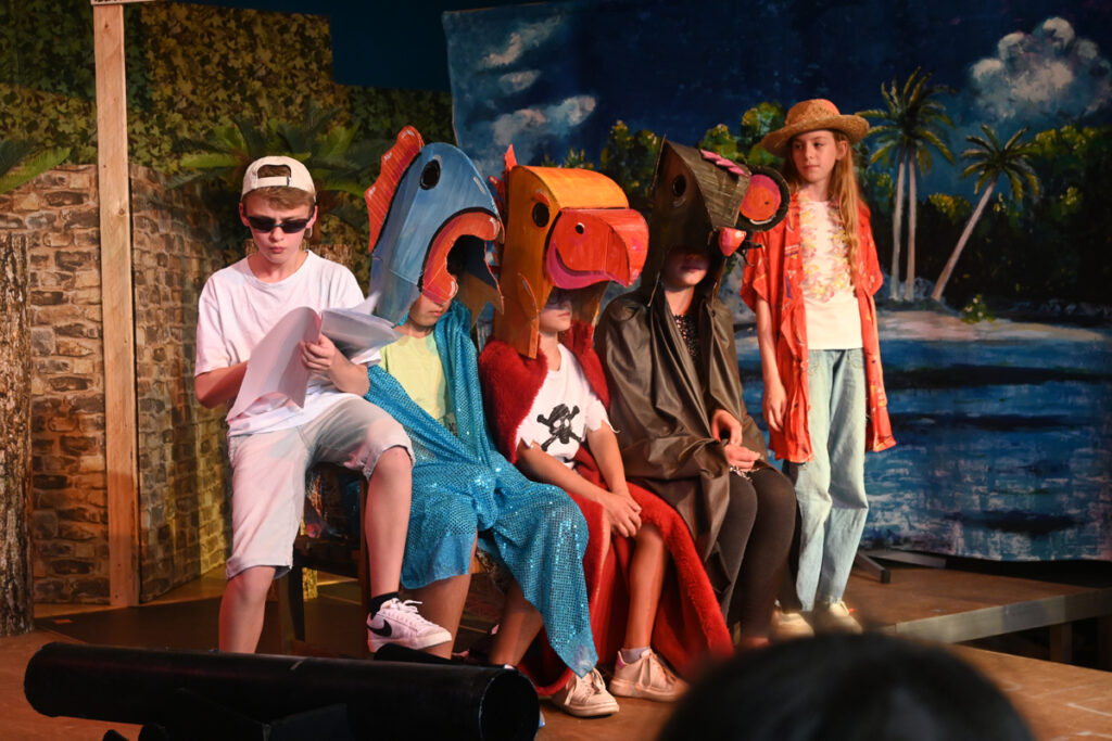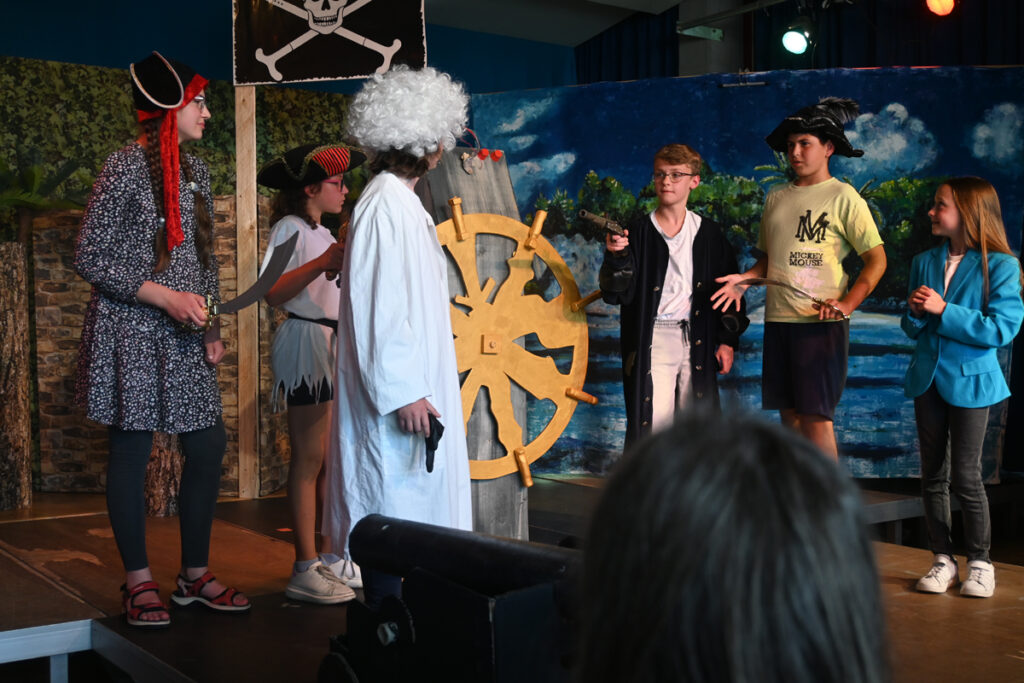 Ernst Greinacher, Musikpädagoge am Gymnasium, bei der Aufführung „Der Schatzinsel“ zusammen mit einigen seiner jungen Schauspieler. Szenenbild von der ersten Aufführung. Heute (20. Juni) wird das Musical letztmals aufgeführt: um 19.00 Uhr im Gymnasium.
