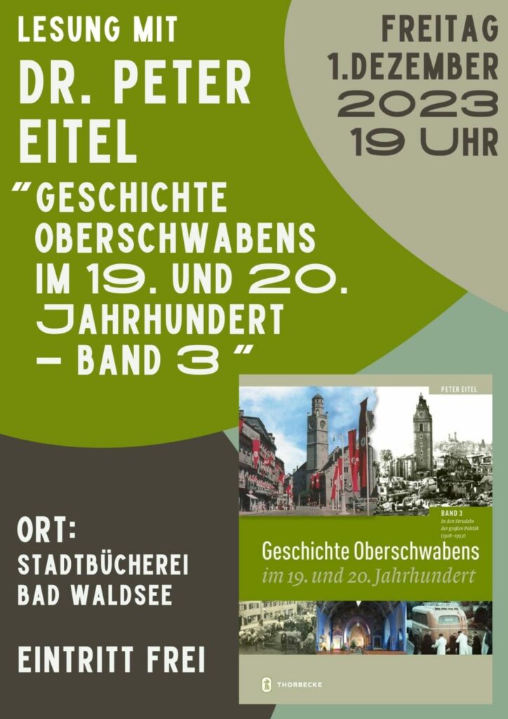 Bad Waldsee – Am 1. Dezember liest der frühere Ravensburger Stadtarchivar Dr. Peter Eitel aus dem 3. Band seiner „Geschichte Oberschwabens im 19. und 20. Jahrhundert“, der die Jahre 1918 bis 1952 umfasst und der in den Medien große Beachtung gefunden hat. Die Lesung in der Stadtbücherei beginnt um 19.00 Uhr. Der Eintritt ist frei.