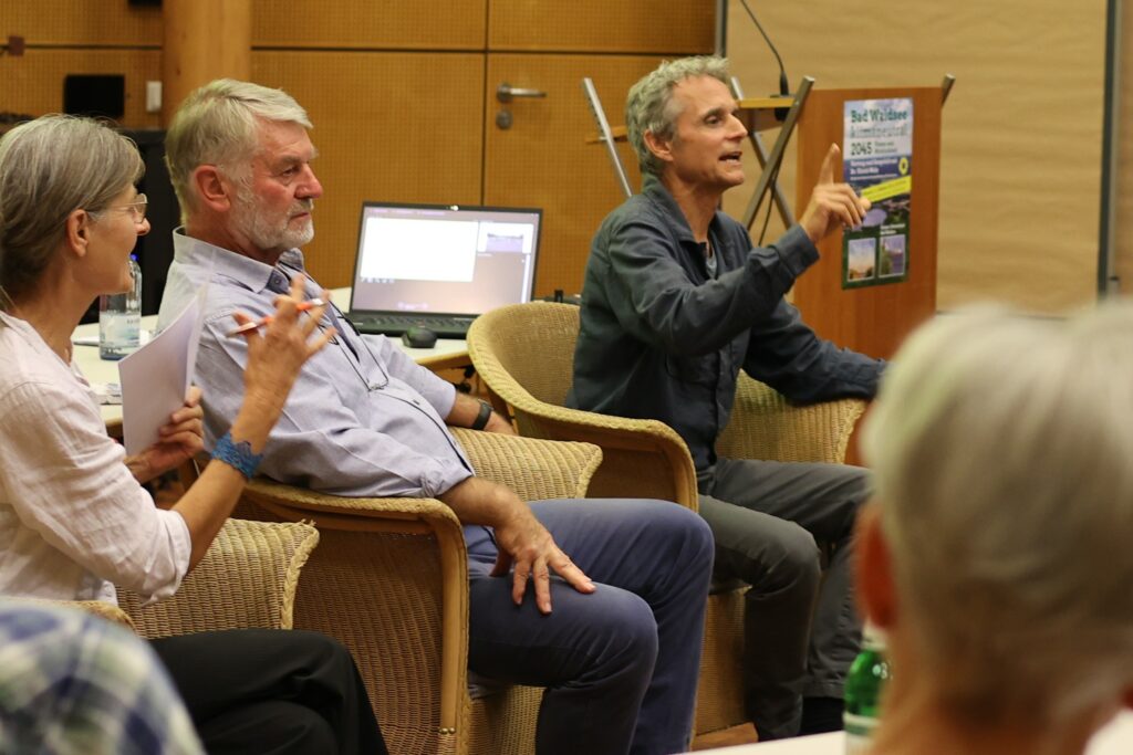„Mit den Windkraftanlagen laufen wir in eine flächendeckende Industrialisierung“, klagte Wolfgang Hübner und Reinhold Mall bedauert die Verschandelung der Landschaft und den mangelnden Natur- und Vogelschutz. Der Kurbetrieb würde Schaden nehmen. Aber Dr. Walz sieht ein klimaneutrales Bad Waldsee als eine positives zukünftiges Alleinstellungsmerkmal. Die Diskussion geriet darüber in emotional aufgewühlte Fahrwasser. Für Wolfgang Hübner ist die Energiepolitik der Landesregierung nicht zielführend, der Bürger werde bei den Angaben zum Flächenbedarf für Windkraft und Freiflächen-PV getäuscht. Ein Vertreter aus Vogt sprach wörtlich von „Märchen“. Hübner beklagte zudem die Form der Aussprache, das sei keine demokratische Diskussion, sondern gelenkt. Die lebhaft und emotional geführte Diskussion im Plenum endet um 21.45 Uhr, wie von den Veranstaltern vorgegeben. In kleinen Runden gingen die Diskussionen noch weiter.