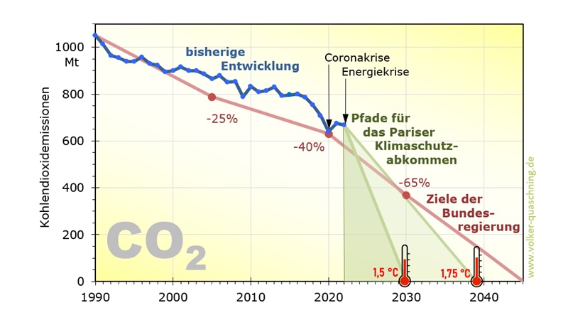 Die blaue Linie beschreibt die bis jetzt erreichte Reduzierung des CO2-Ausstoßes in Deutschland. Die rote Linie beschreibt die Reduzierungsziele der Bundesregierung, die laut dieser von Dr. Walz gezeigten Grafik das 1,5-Grad-Ziel des Pariser-Klimaschutz-Abkommens nicht erreichen.