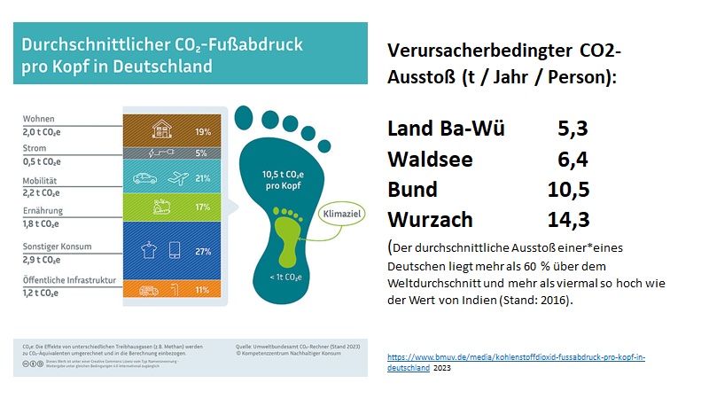 Auf jede Person in Bad Waldsee entfällt im Schnitt pro Jahr ein CO2-Ausstoß von 6.4 Tonnen (im Land Baden-Württemberg sind es 5,3 t, im Bund 10,5 t und in Bad Wurzach mit dem Sonderfall Glasfabrik sogar 14.3 t).