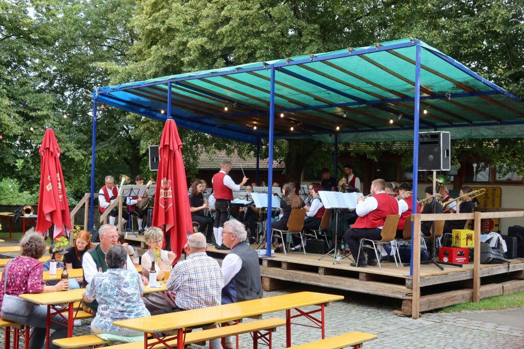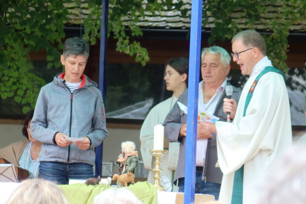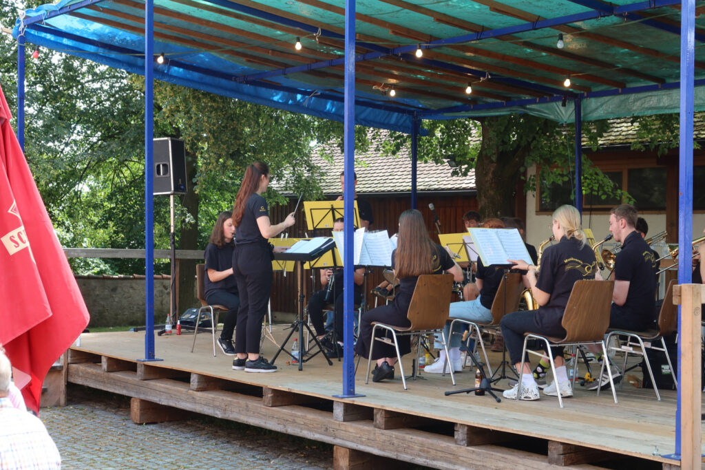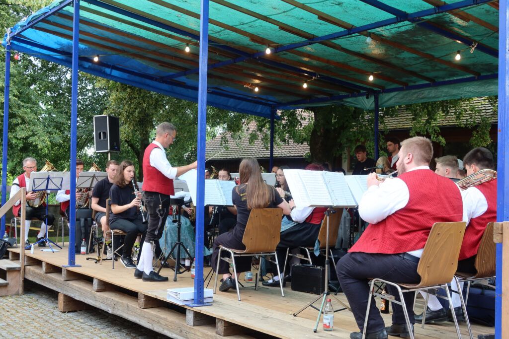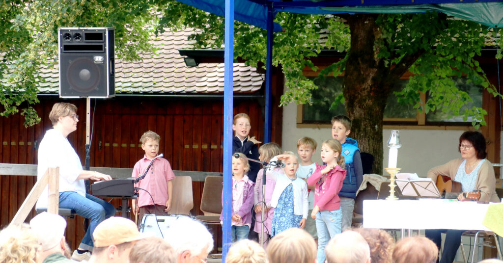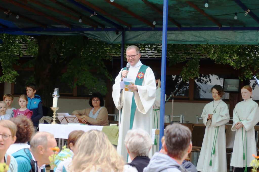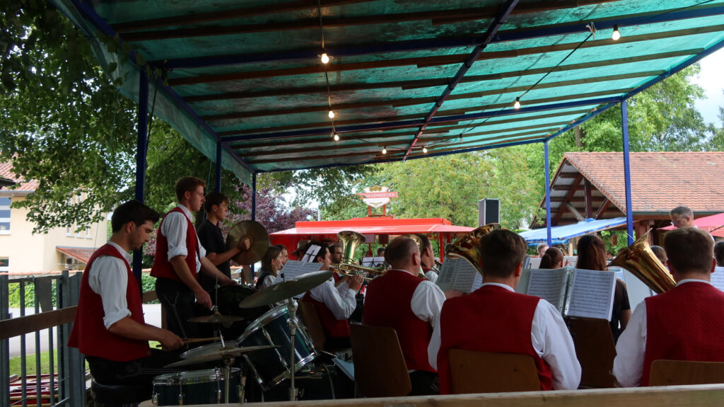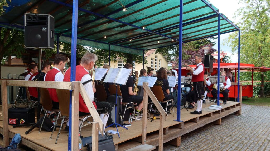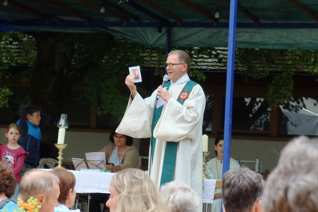 Am Sonntagvormittag wurde das Fest mit einem Familiengottesdienst im Burghofareal eröffnet. Zelebrant war Pfarrer Thomas Bucher. Alle Gottesdienstbesucher hatten ein kleines Bild erhalten, das Jesus als Hirte zeigt, der sich um seine Schafe kümmert, auch um die verlorenenen. Diese frohe Botschaft, an die Pfarrer Thomas Bucher erinnerte, ebnet uns den Weg zum Vater und zum Ewigen Leben, so das Fazit. Feierlich umrahmt wurde die Eucharistiefeier vom Johannes-Chörle unter Leitung von Theresia Fischer, die den erfrischenden Kindergesang am Keyboard begleitete, wie auch Martina Spähn an der Gitarre. Als weitere Instrumentalisten beim Familiengottesdienst wirkten Linda Sigg (Querflöte), Beate Miller (Klarinette) und Gesangssolistin Kristina Hepp mit. Allen wurde nach den Dankesworten von Pfarrer Thomas Bucher dankbarer und anhaltender Beifall gespendet, wie auch dem Vorbereitungsteam der Musikkapelle um Matthias Preiß und Kristina Hepp.