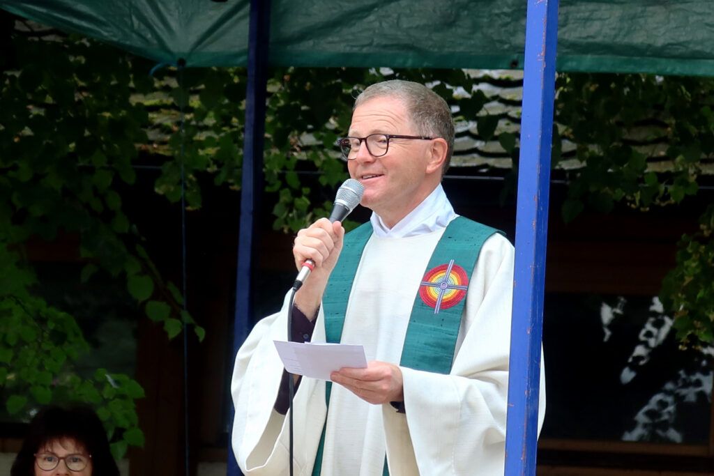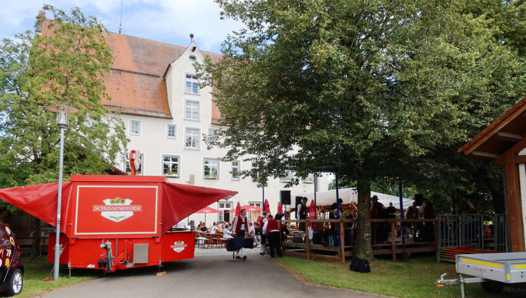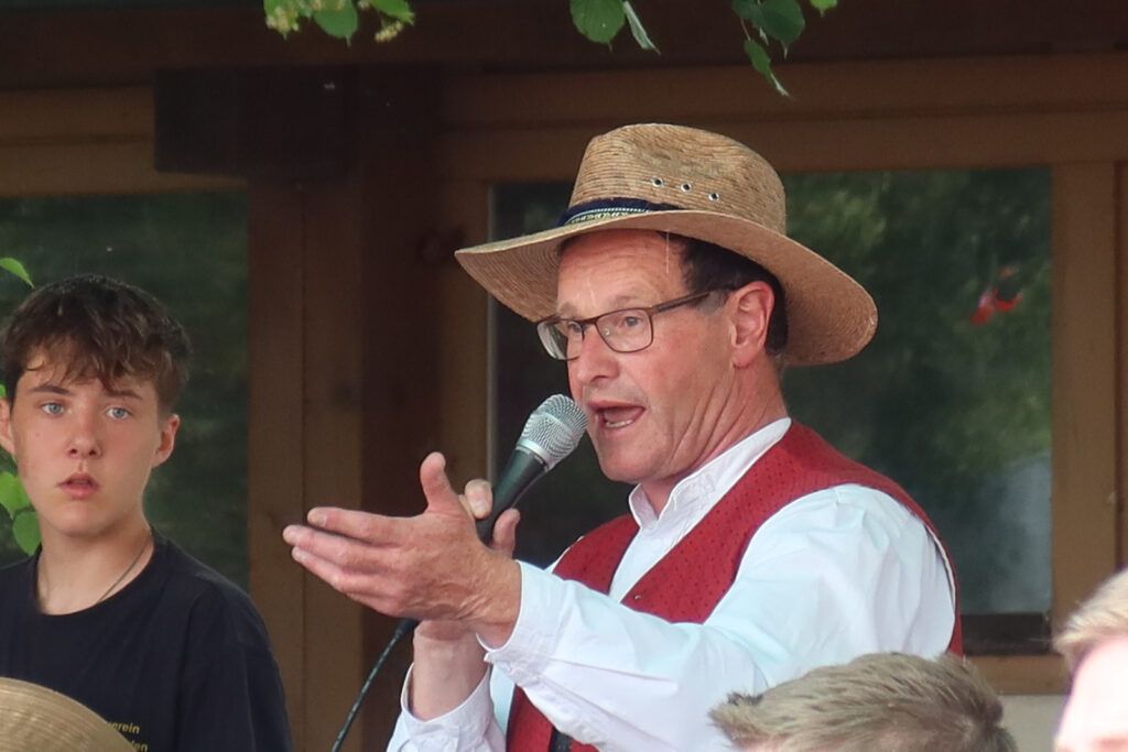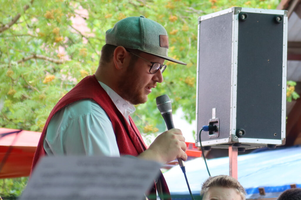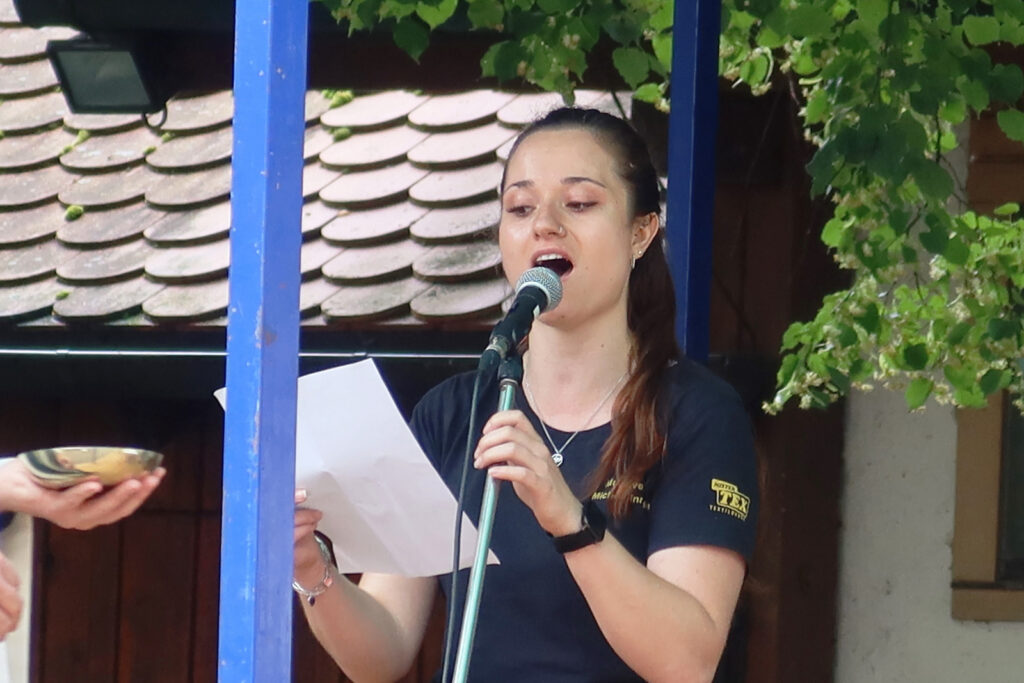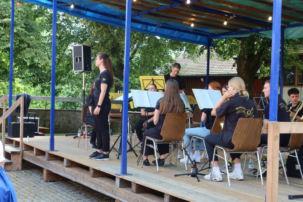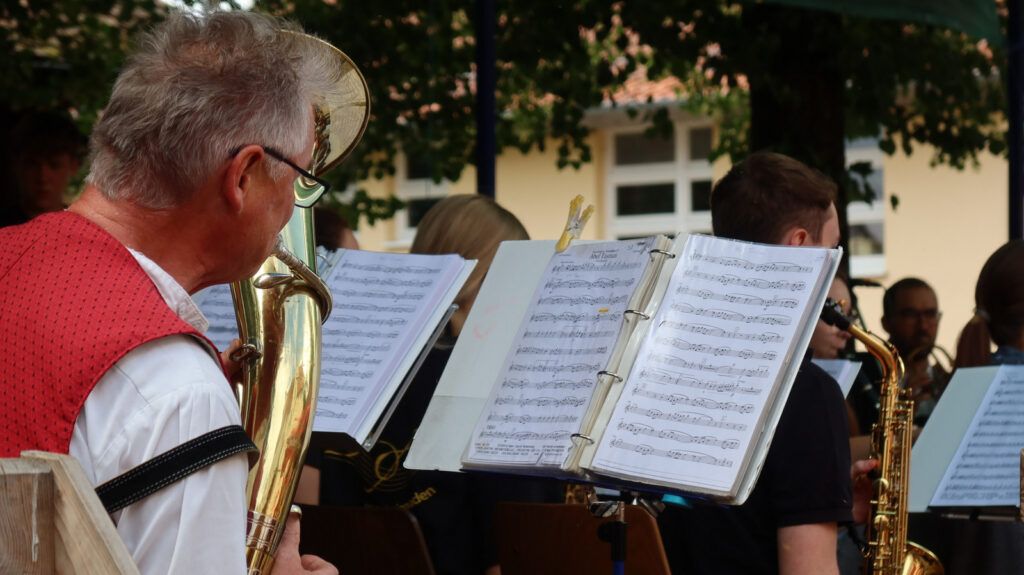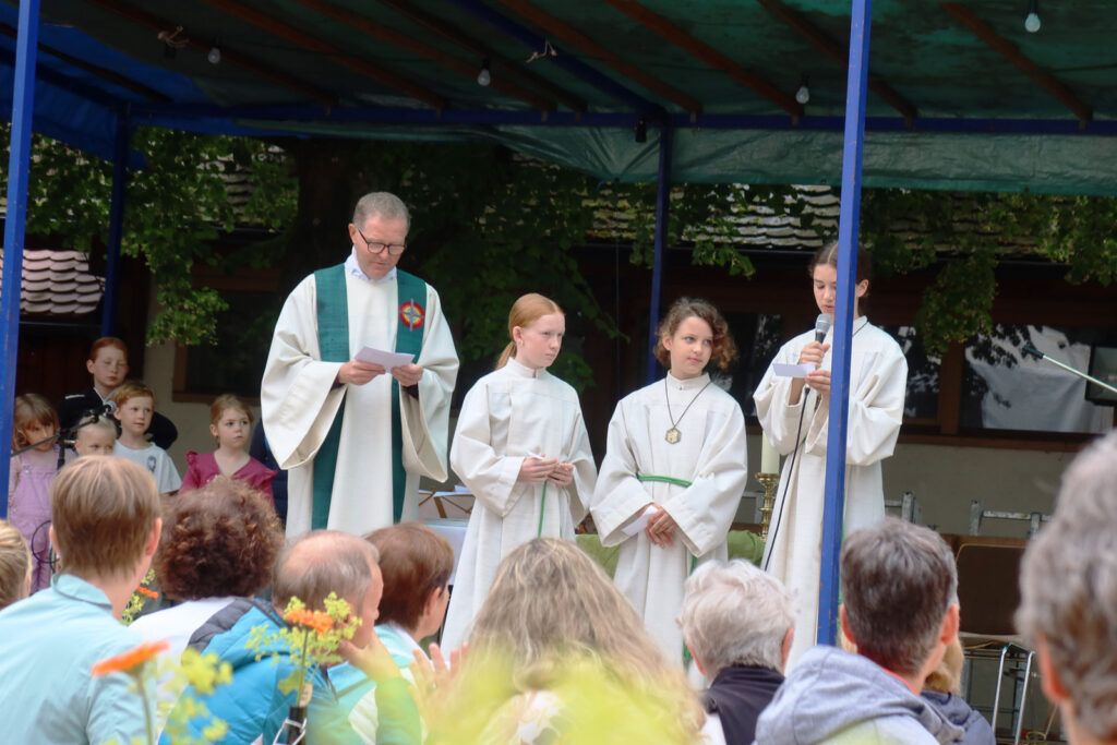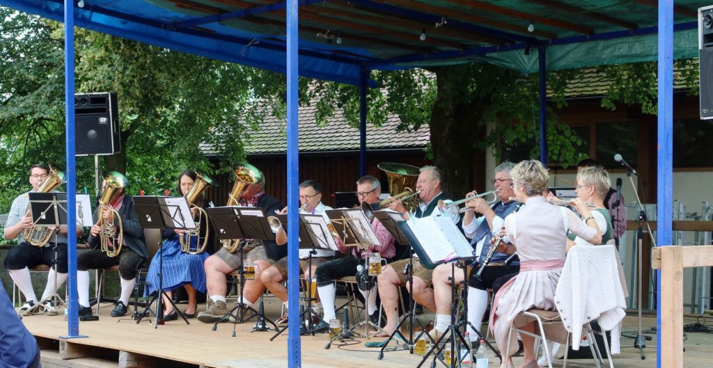Am Sonntagvormittag wurde das Fest mit einem Familiengottesdienst im Burghofareal eröffnet. Zelebrant war Pfarrer Thomas Bucher. Alle Gottesdienstbesucher hatten ein kleines Bild erhalten, das Jesus als Hirte zeigt, der sich um seine Schafe kümmert, auch um die verlorenenen. Diese frohe Botschaft, an die Pfarrer Thomas Bucher erinnerte, ebnet uns den Weg zum Vater und zum Ewigen Leben, so das Fazit. Feierlich umrahmt wurde die Eucharistiefeier vom Johannes-Chörle unter Leitung von Theresia Fischer, die den erfrischenden Kindergesang am Keyboard begleitete, wie auch Martina Spähn an der Gitarre. Als weitere Instrumentalisten beim Familiengottesdienst wirkten Linda Sigg (Querflöte), Beate Miller (Klarinette) und Gesangssolistin Kristina Hepp mit. Allen wurde nach den Dankesworten von Pfarrer Thomas Bucher dankbarer und anhaltender Beifall gespendet, wie auch dem Vorbereitungsteam der Musikkapelle um Matthias Preiß und Kristina Hepp.