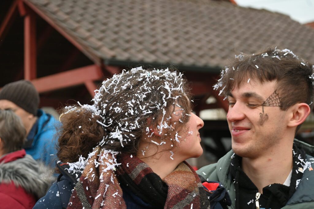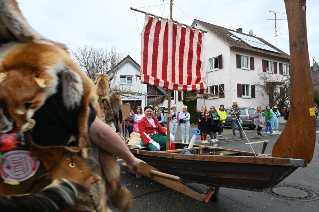 Die Wickinger aus Wilhelmsdorf hatten ein leibhaftiges Wikingerboot mit im Umzug dabei, das nach allen Richtungen der Windrose unterwegs war. Die Narren mit den langen Auszugsscheren trieben mit den Zuschauern allerhand Schabernack. Auch der ehrwürdige Dachauer des Reporters wurde eine Beute der Schere und erst wieder gut mit Konfetti gefüllt dem Besitzer auf den Kopf gestülpt. Außer Konfetti gab’s auch eine gute Ladung Heu in den Kragen und manches Mädchen am Umzug bekam die Haare verwuschelt und mit ordentlich Konfetti verziert. Etliche Hexen hatten ihre Karren mit „wohlriechenden“ Hexenfeuern dabei. Wie immer waren auch hier meist die jungen Mädchen bevorzugte Kandidatinnen für eine Mitfahrt auf dem Hexenkarren. OB Matthias Henne ließ sich ebenfalls in Reute sehen. Vom Tribünenwagen aus verfolgte er zusammen mit der Präsidentin der Narrengilde das Treiben.