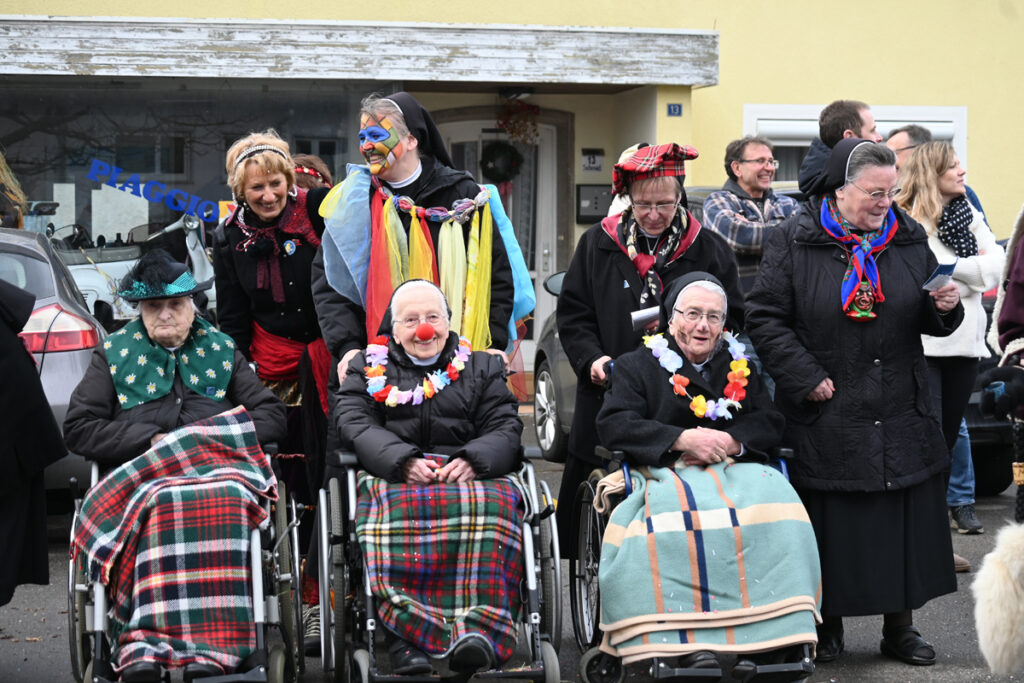 Bus um Bus rollte an. Rund um das Kloster waren alle Plätze besetzt und die Autofahrer taten gut daran, möglichst weit vom Festgeschehen einen Platz zu suchen. Auf den Aufstellungsplätzen fieberten die Hästräger dem Umzug entgegen. Punkt 13.30 Uhr eröffnete der Büttel zusammen mit seinen Kanonieren und dem Reutener Narrensamen den Festumzug. Manch Mäschkerle und Zuschauer schaute mit sorgenvoller Miene an den grauen Himmel, denn immer wieder kam ein kleines nasses Tröpfchen vom Himmel geflogen. Aber Petrus hatte ein Einsehen und die gute Beziehung des Klosters in die himmlischen Gefilde trugen sicher auch das Ihrige bei und sorgten für einen, zumindest äußerlich, trockenen Festverlauf.