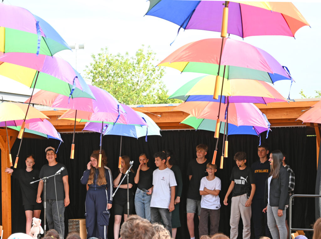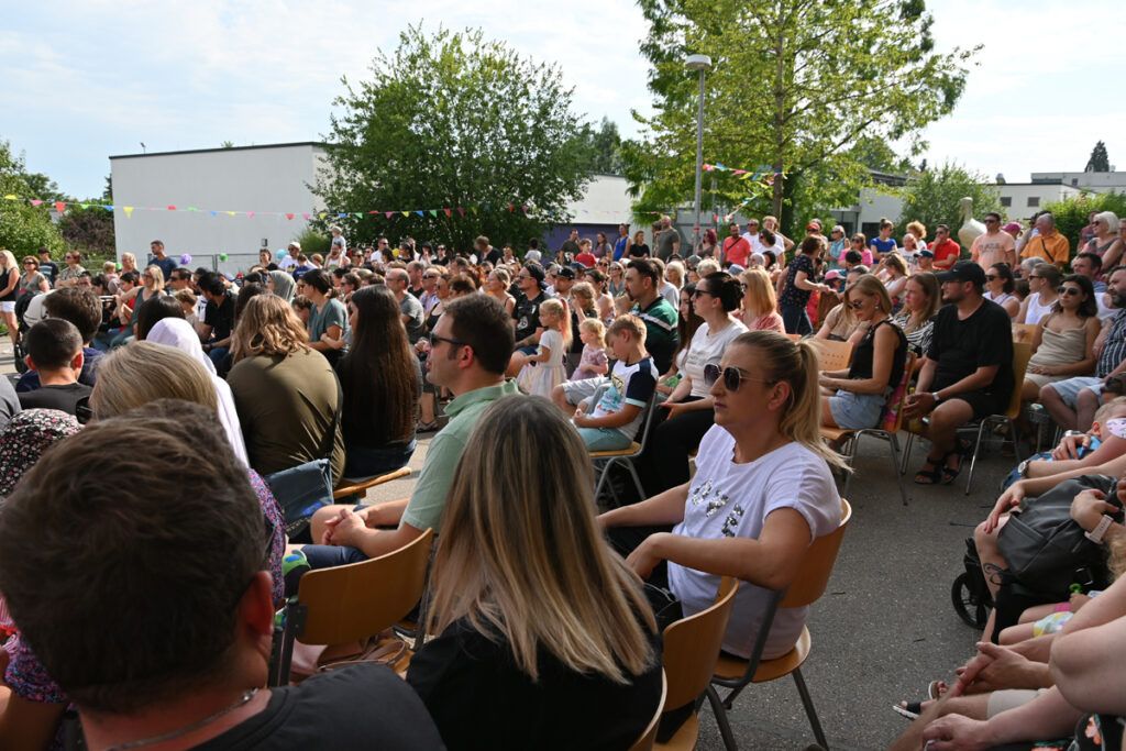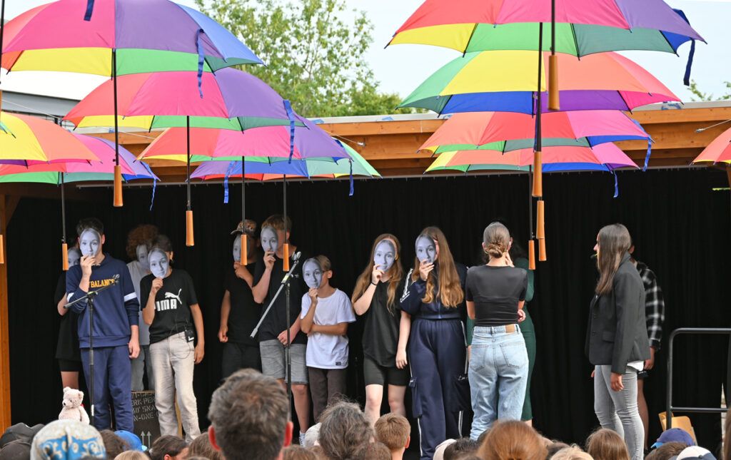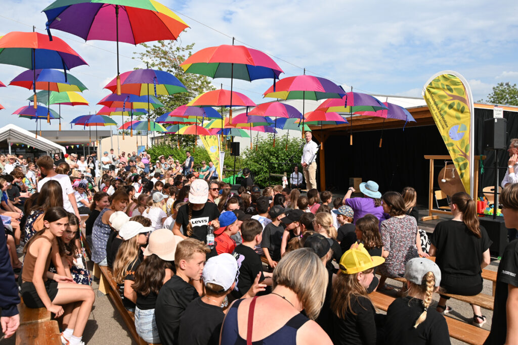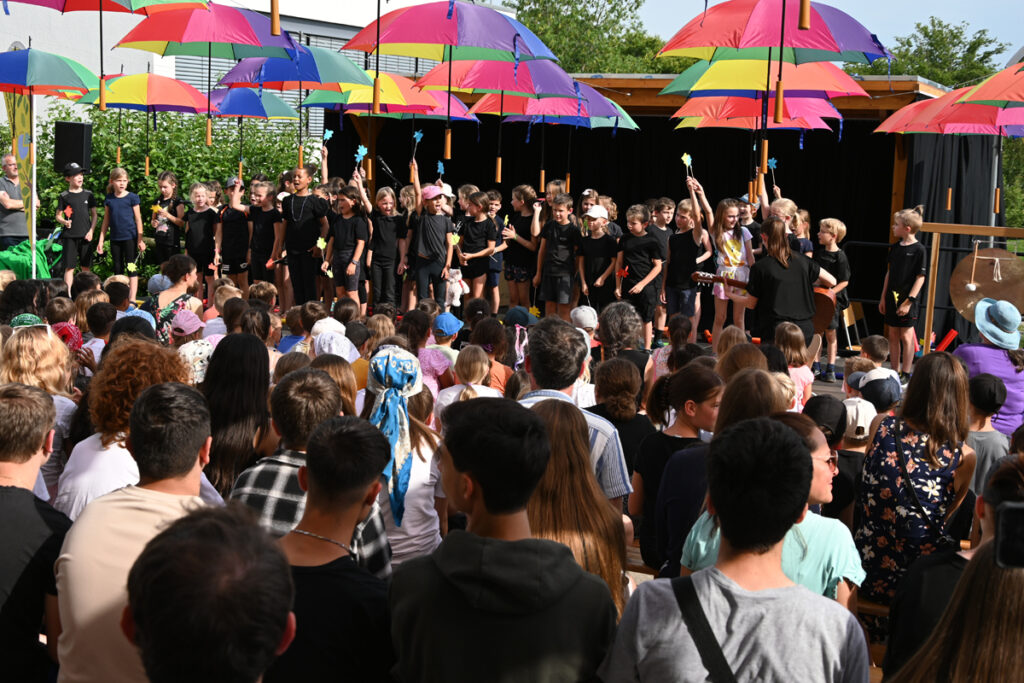 Der Schulhof war geschmückt mit vielen bunten Regenschirmen, die an Fäden aufgehängt vom Schulpavillon bis zur Bühne über den Besuchern schwebten. Grob geschätzt 300 Eltern hatten auf den Stühlen Platz genommen, als die Grundschüler, angeführt von ihren Lehrerinnen, in einer sternförmigen Parade einzogen und auf den vorderen Bänken Platz nahmen.