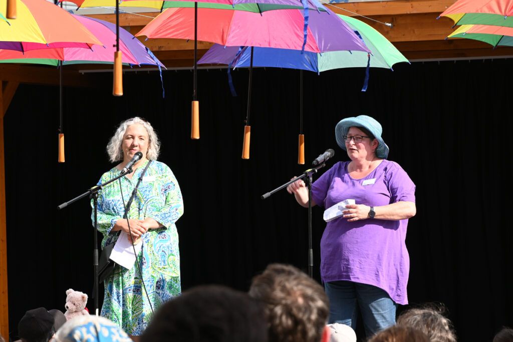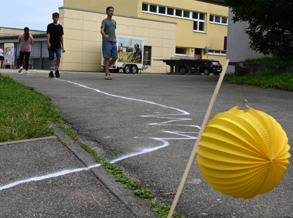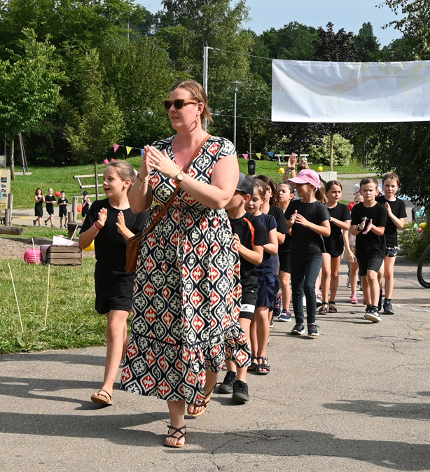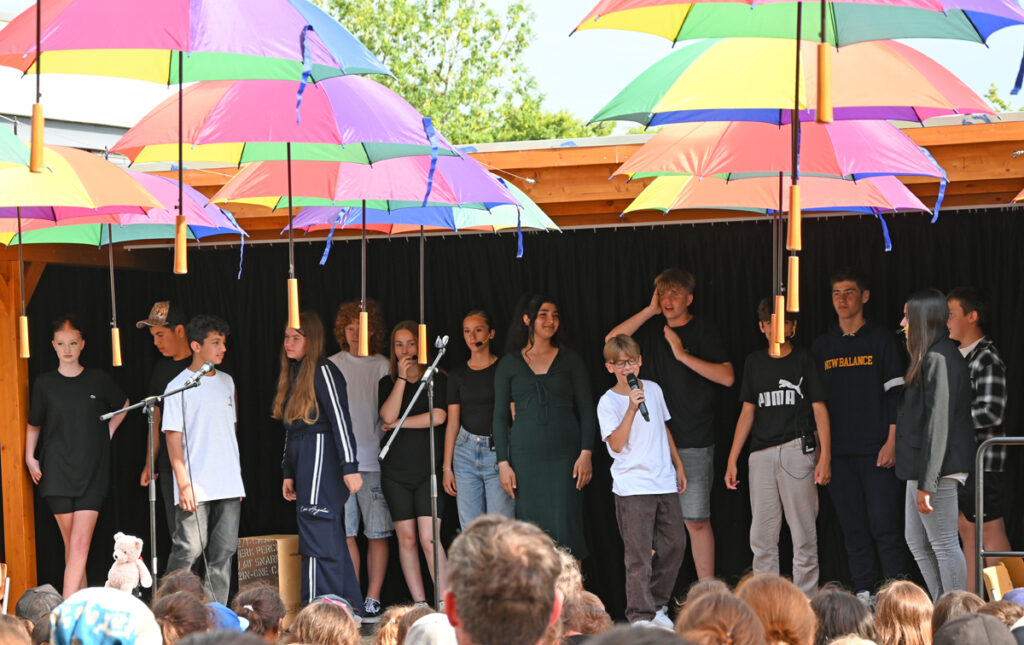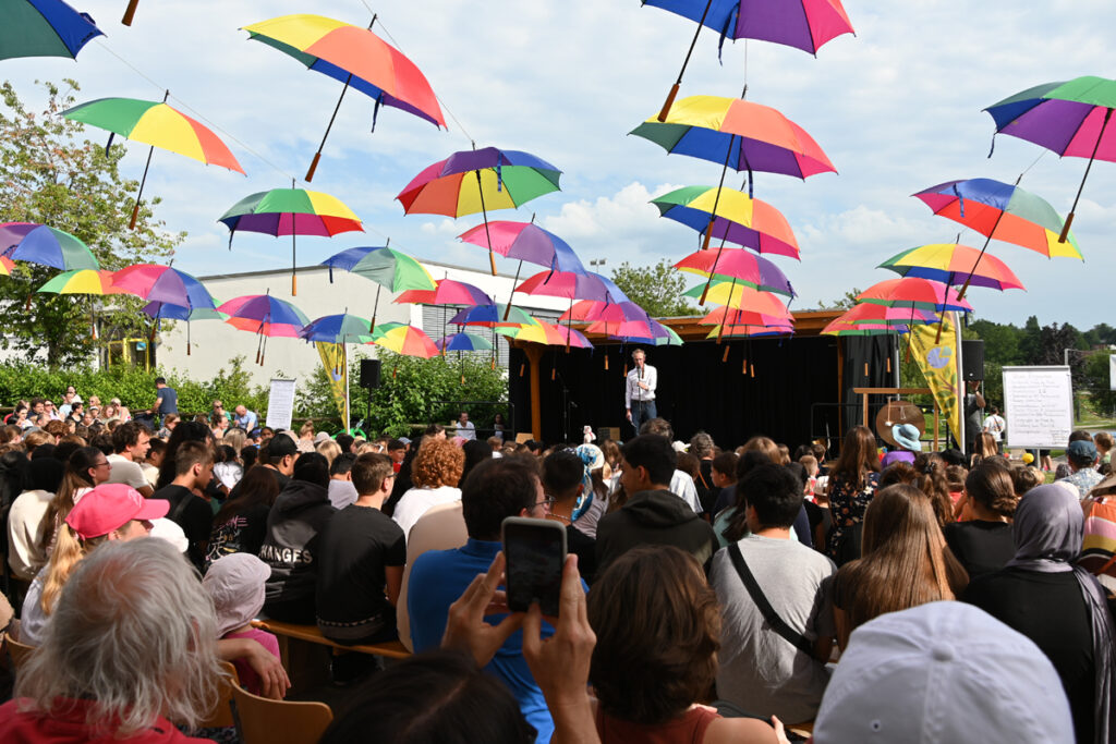 Der Schulhof war geschmückt mit vielen bunten Regenschirmen, die an Fäden aufgehängt vom Schulpavillon bis zur Bühne über den Besuchern schwebten. Grob geschätzt 300 Eltern hatten auf den Stühlen Platz genommen, als die Grundschüler, angeführt von ihren Lehrerinnen, in einer sternförmigen Parade einzogen und auf den vorderen Bänken Platz nahmen.
