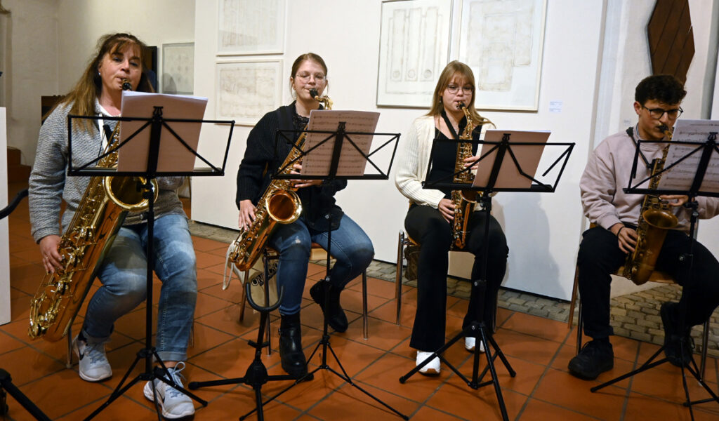 Axel F. Otterbach und das Museums-Team konnten sich über viele Besucher bei der Vernissage freuen. Ein Saxophon-Quartett (Bild) des Jugendmusikschule Bad Waldsee gab der Vernissage den gebührenden musikalischen Rahmen.