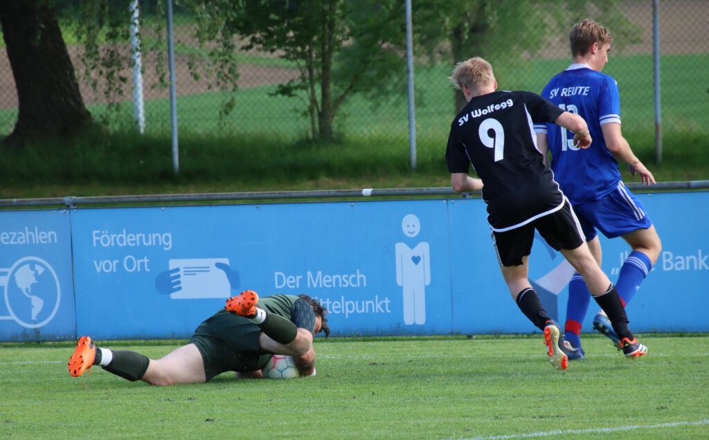 Gegen die Wolfegger Gäste begann der SV Reute sehr stark und hatte direkt in der Anfangsphase bereits zwei gute Gelegenheiten zum Führungstreffer, doch der Gästekeeper zeigte sich hellwach auf dem Posten. Danach tat sich in den Strafräumen auf beiden Seiten aber nicht mehr all zu viel, sowohl der SV Wolfegg als auch die Hausherren standen defensiv sehr solide und ließen nichts anbrennen. So ging es fast logischerweise mit einem torlosen Remis in die Halbzeitpause. Die zweite Spielhälfte hatte zu Beginn offensiv wieder mehr zu bieten. Zunächst konnte SVR-Keeper Daniel Briegel glänzend gegen den auf rechts durchgebrochenen Martin Adler retten. Auf der anderen Seite tankte sich Maurice Epple auf links durch und Wolfegg konnte den Reutener Führungstreffer im letzten Moment verhindern. Der goldene Treffer fiel nach gut einer Stunde Spielzeit, als Wolfegg sich auf rechts schön durchspielte und der nach der Halbzeit eingewechselte Marvin Heiß frei im Strafraum zum 0:1 einschieben konnte. Reute versuchte in der verbleibenden letzten halben Stunde noch einmal alles, doch die Gäste standen nach wie vor felsensicher und ließen weiterhin kaum etwas zu. Die Schlussphase wurde noch hektisch und es gab eine lange Nachspielzeit. Auch wenn der SVR am Ende durch eine Ampelkarte der Gäste noch in numerischer Überzahl war, gelang kein Treffer mehr und die Serie mit sieben Begegnungen ohne Niederlage ist damit zu Ende. Mit einem Dreier hätte der SV Reute bereits den Klassenerhalt fix machen können, der Vorsprung auf den ersten Abstiegsplatz beträgt zwei Spieltage vor Saisonende vier Punkte. Am kommenden Spieltag geht’s zum Tabellenzweiten SG Aulendorf, ehe zum Saisonfinale der FC Kosova Weingarten am Reutener Durlesbach gastiert.