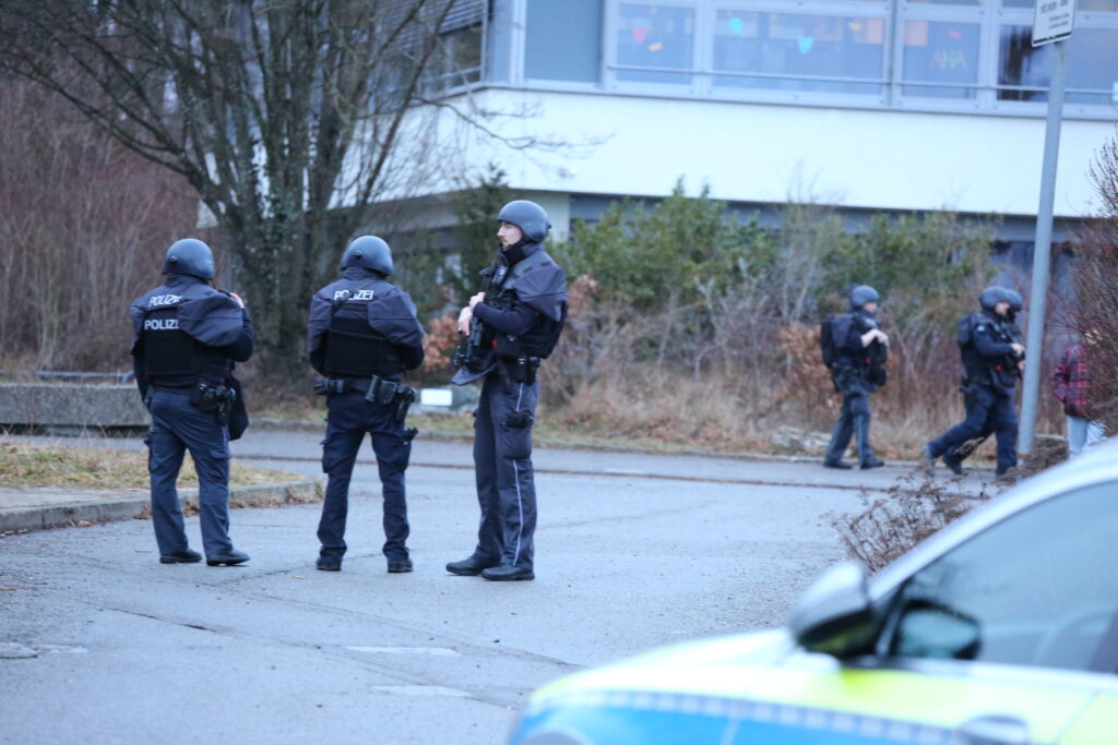 Schwerbewaffnete Polizisten am Bad Waldseer Schulzentrum. Foto: David Pichler.