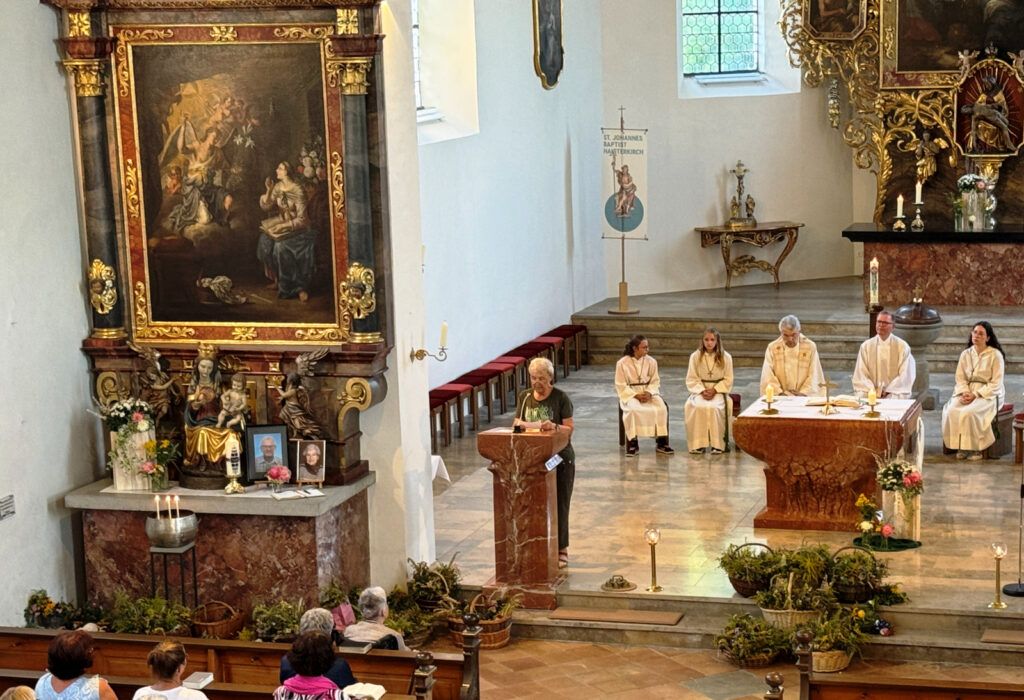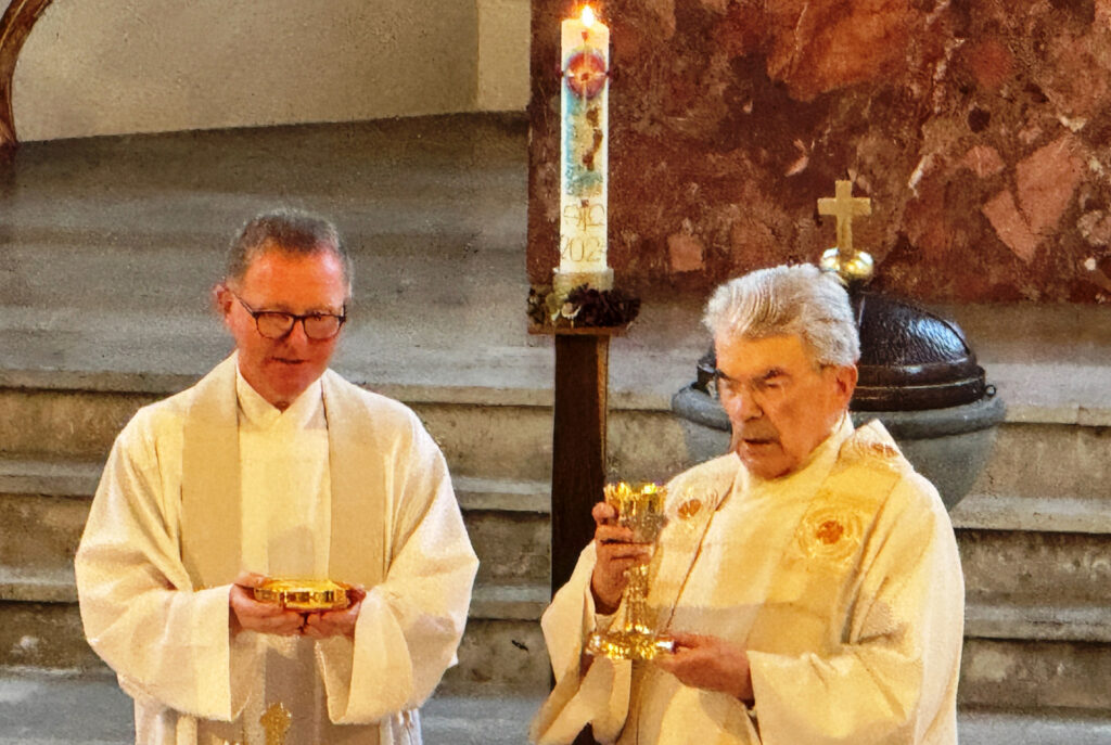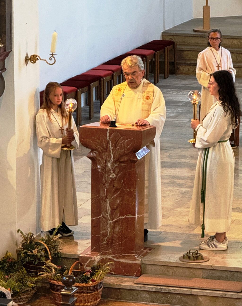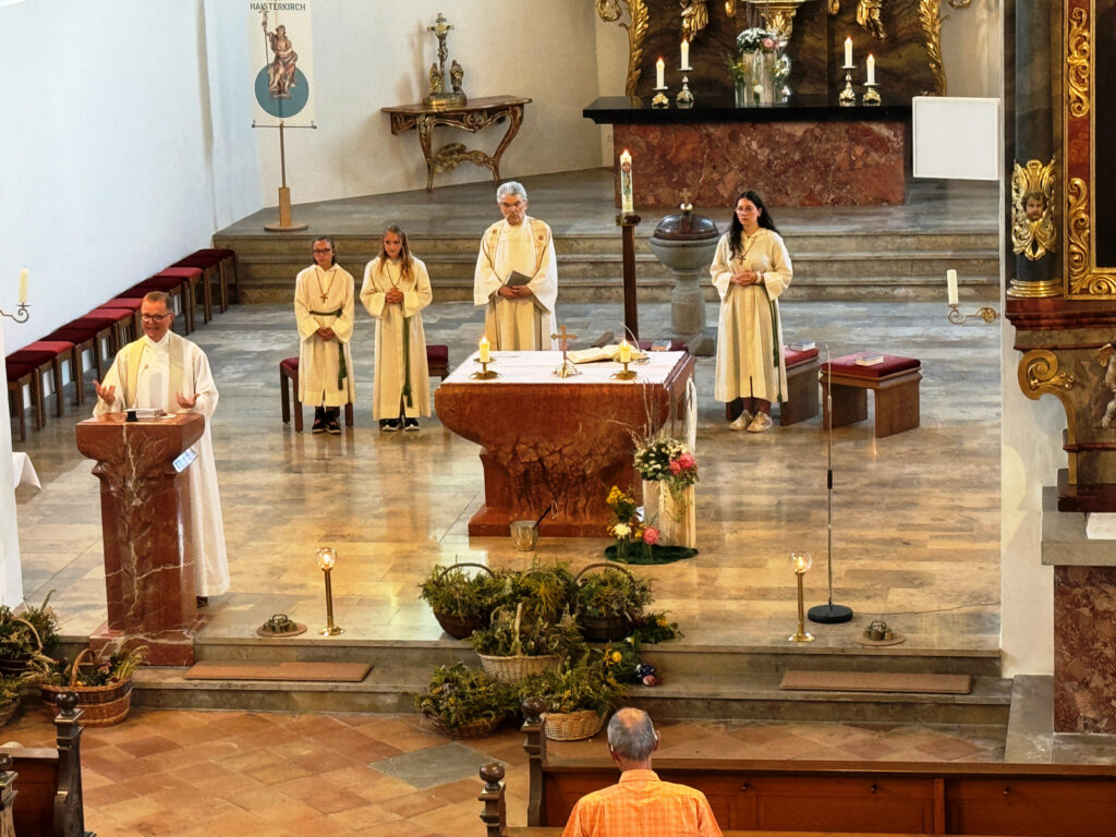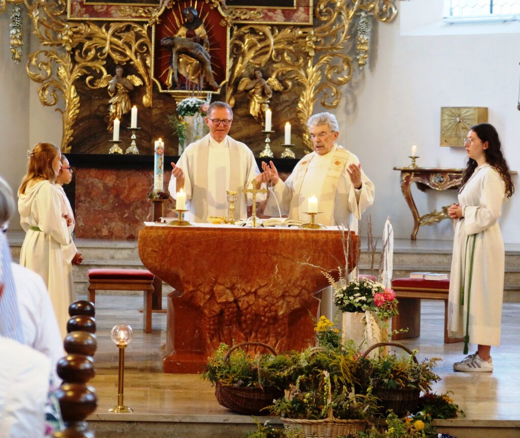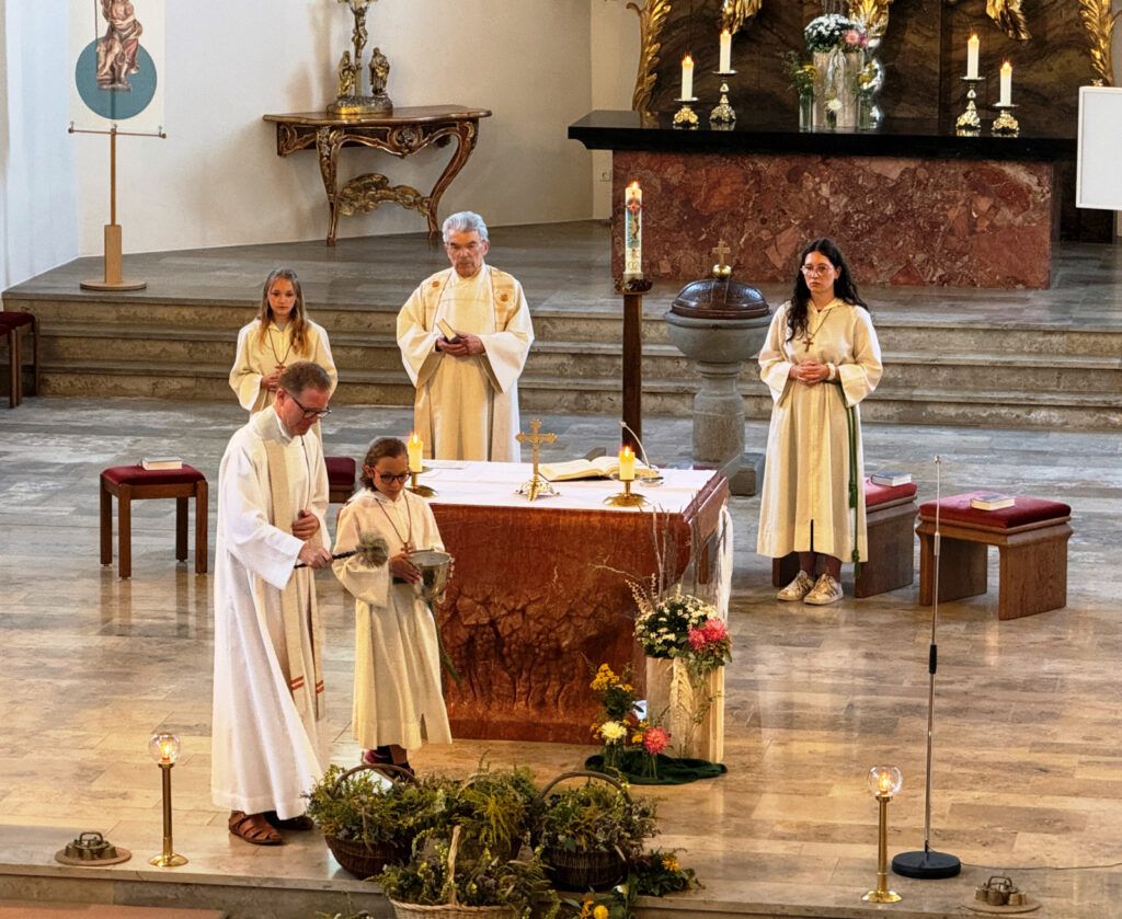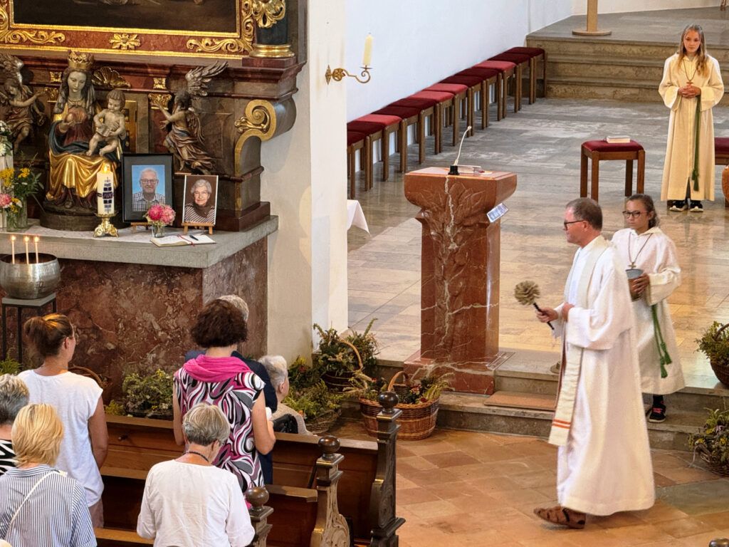 Sie feierten dort an diesem herrlichen Sommerabend gemeinsam mit Pfarrer Thomas Bucher und Pfarrer i. R. Josef Mattes eine hl. Messse. Gleich zu Beginn der Eucharistiefeier erinnerte Pfarrer Thomas Bucher daran, dass an diesem Tag das Hochfest „Mariä Aufnahme in den Himmel“ weltweit in der katholischen Kirche gefeiert wird.