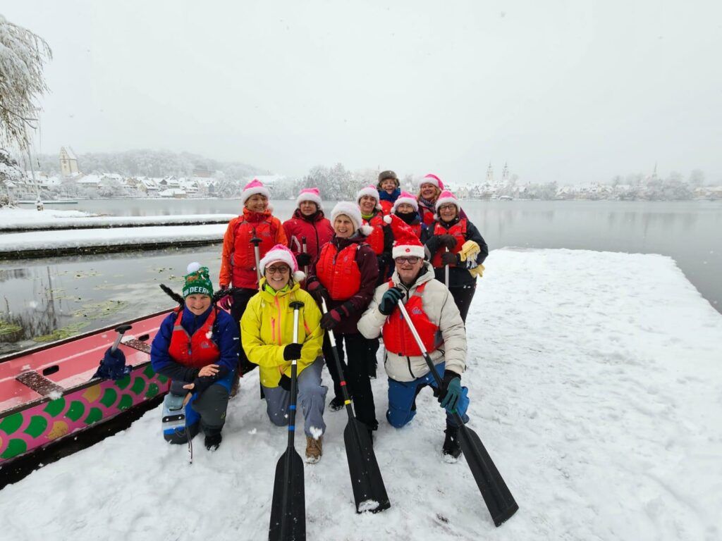 Endlich war das Boot im Wasser. Bei Schneefall und herrlicher Kulisse war dies atemberaubend und wunderschön! Die Paddlerinnen drehten mit dem Boot mehrere Runden auf dem Stadtsee, was einige Spaziergänger rund um den Stadtsee lächelnd, winkend und fotografierend wahrnahmen. Das pinke Drachenboot und die pinken Nikolausmützen der Paddlerinnen waren weithin am verschneiten Uferweg sichtbar.