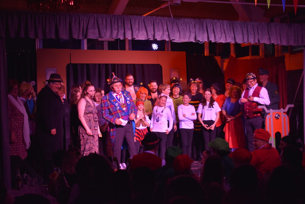 Abschließend bat Magdalena Bohner alle Akteure und einige Helfer aus dem Hintergrund auf die Bühne bis dann Gerhard Frick in seiner Abschlusslaudatio seinen Stolz auf die Helfer und Akteure des Vereins zum Ausdruck brachte. Das Publikum belohnte alle Beteiligten mit lange anhaltenden Beifällen. Es wurde auch auf weitere Termine in der Königstäler Fasnet aufmerksam gemacht: Sammeln am 21. und 22. Februar, Kinderball am 28. Februar, sowie Umzug am 1. März