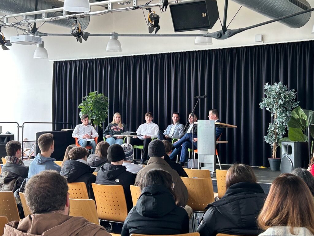 Die Klassen 11 sowie die Kursstufen 1 und 2 hatten im Vorfeld im Unterricht Fragen erarbeitet, die dann in einer Podiumsdiskussion mit Norbert Lins, dem Mitglied des Europäischen Parlaments, Oberbürgermeister Henn sowie Schülern und einer Schülerin aus K1 und 2 geführt wurde. Während der Diskussion in der Mensa konnten die jungen Erwachsenen Einblicke in die politische Arbeit eines Abgeordneten erhalten und zu aktuellen politischen Themen diskutieren. Besonders interessant waren hierbei die Einblicke in die Verschmelzung von EU-Policies und deren Umsetzung in den Kommunen.