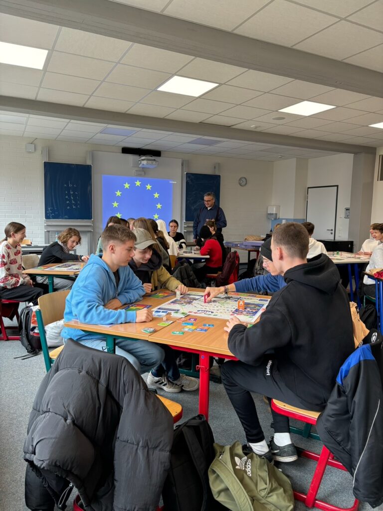 Unter der Leitung der Abteilungsleiterin für die Mittelstufe, Carmen Wunderle, und dem Lehrer für Wirtschaft und Gemeinschaftskunde, Jan Wenzel, sollten mit diesem Projekt die jungen Erstwähler für die anstehenden Wahlen nicht nur vorbereitet, sondern auch interessiert und motiviert werden. Zum einen gab es für die Klassen 10 einen Workshop mit Dr. Nils Bunjes vom Europazentrum in Stuttgart, der mit den Schülern und Schülerinnen das Brettspiel „Legislativity“ zum handlungsorientierten Kompetenzerwerb der EU-Institutionen und EU- Gesetzgebungen erarbeitete.