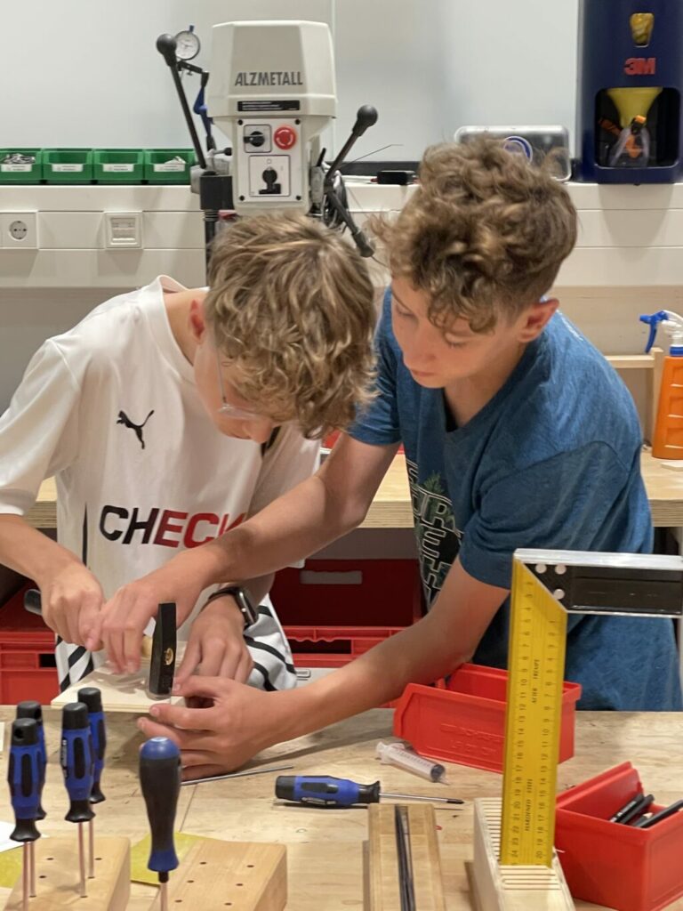 Die zweite Gruppe lernte bei „Elektrotechnik und Löten“ die Grundtechniken des Lötens kennen und baute einen hochsensiblen Leitfähigkeitssensor. Dieser durfte dann an verschiedenen Gegenständen getestet werden und die Überraschung und Freude war groß, als die Schüler feststellten, dass sogar der eigene Körper Strom leitet.
