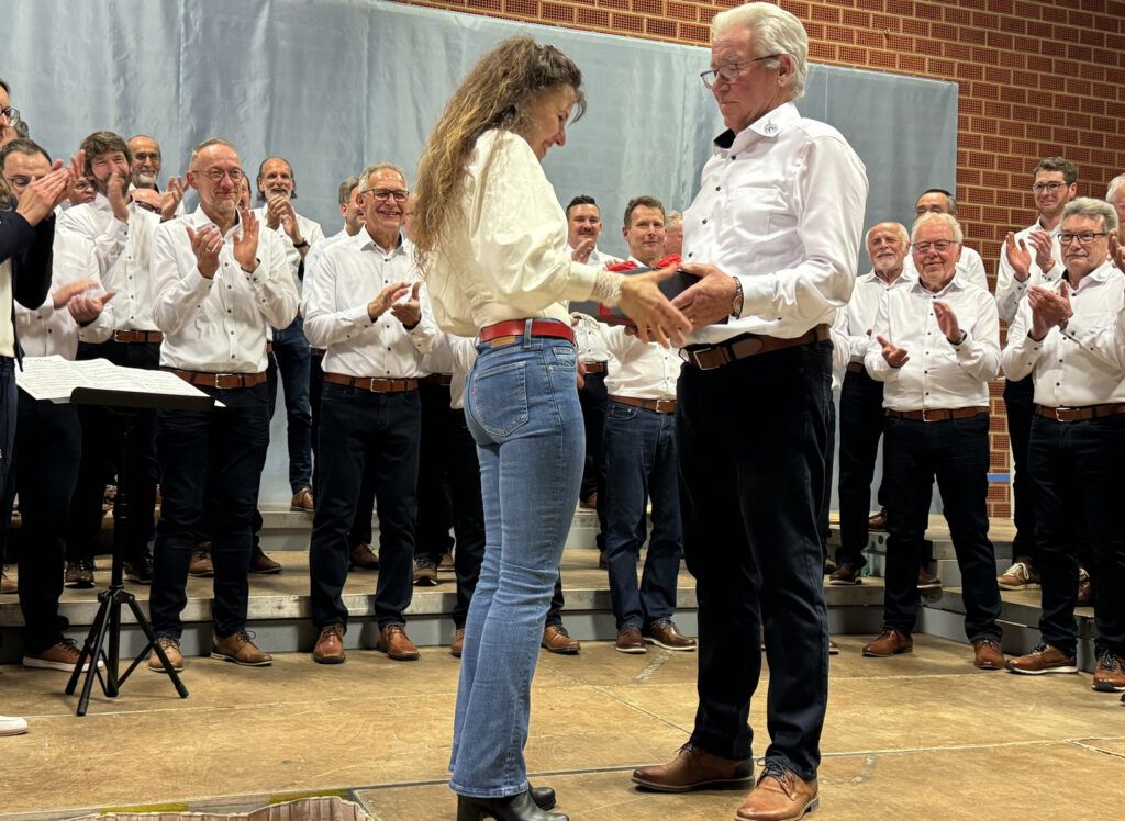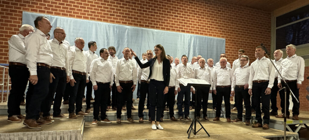 Unter der Gesamtleitung von Chorleiterin Katrin Reichle, die ihre 42 Sänger des MCH und dazu 20 Sänger des Projektchors intensiv auf dieses Jahreskonzert vorbereitet hatte, war das abwechslungsreiche Programm zusammengestellt gestellt worden. Dazu hatte sie auch die Fäden zum Frauenchor aus Alberweiler geknüpft. Katrin war Garantin eines allseits gelungenen, großartigen Konzerts und wurde am Schluss mit riesigem Applaus geradezu überhäuft. Vom Chor erhielt sie ein Geschenk (Bild).