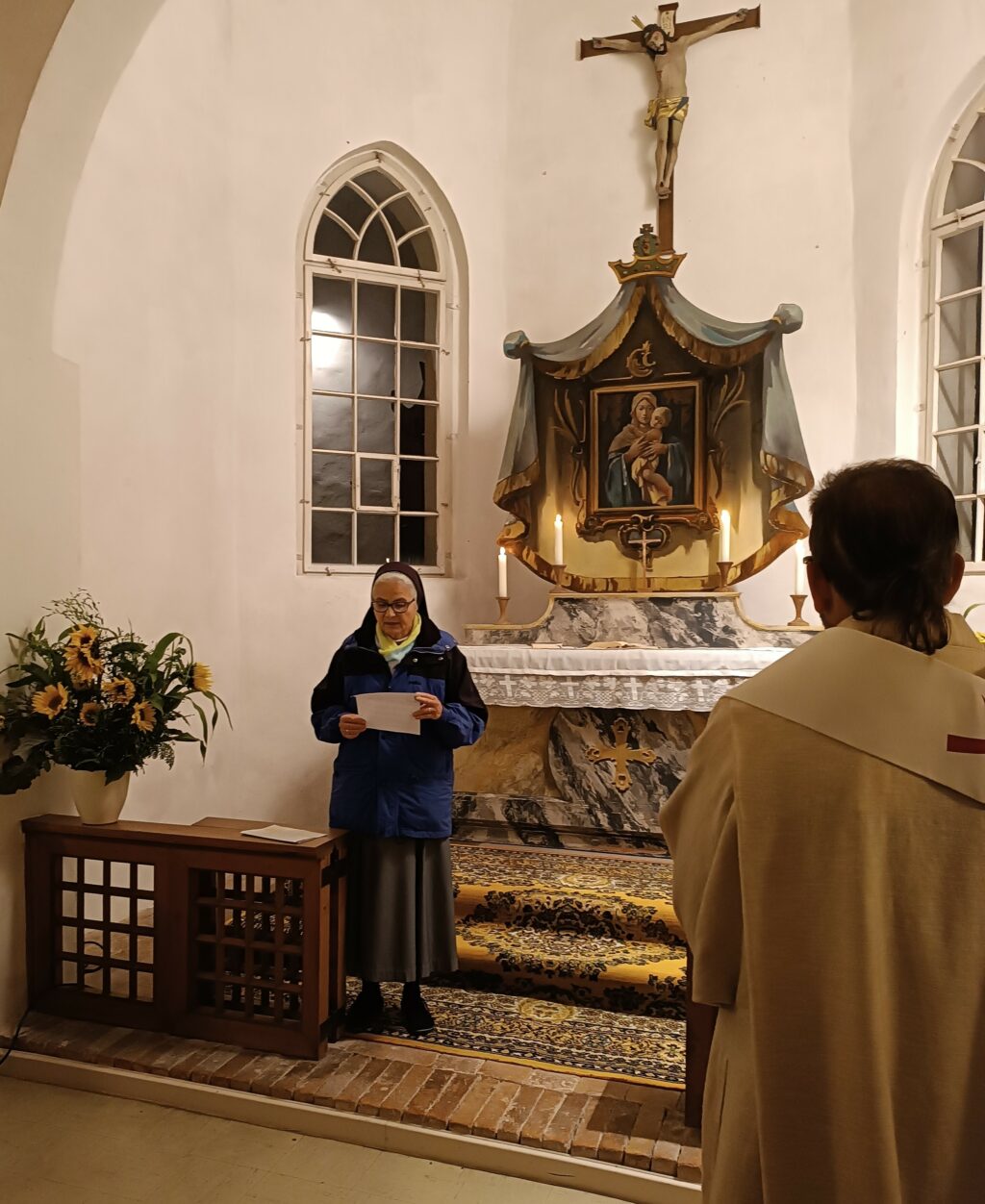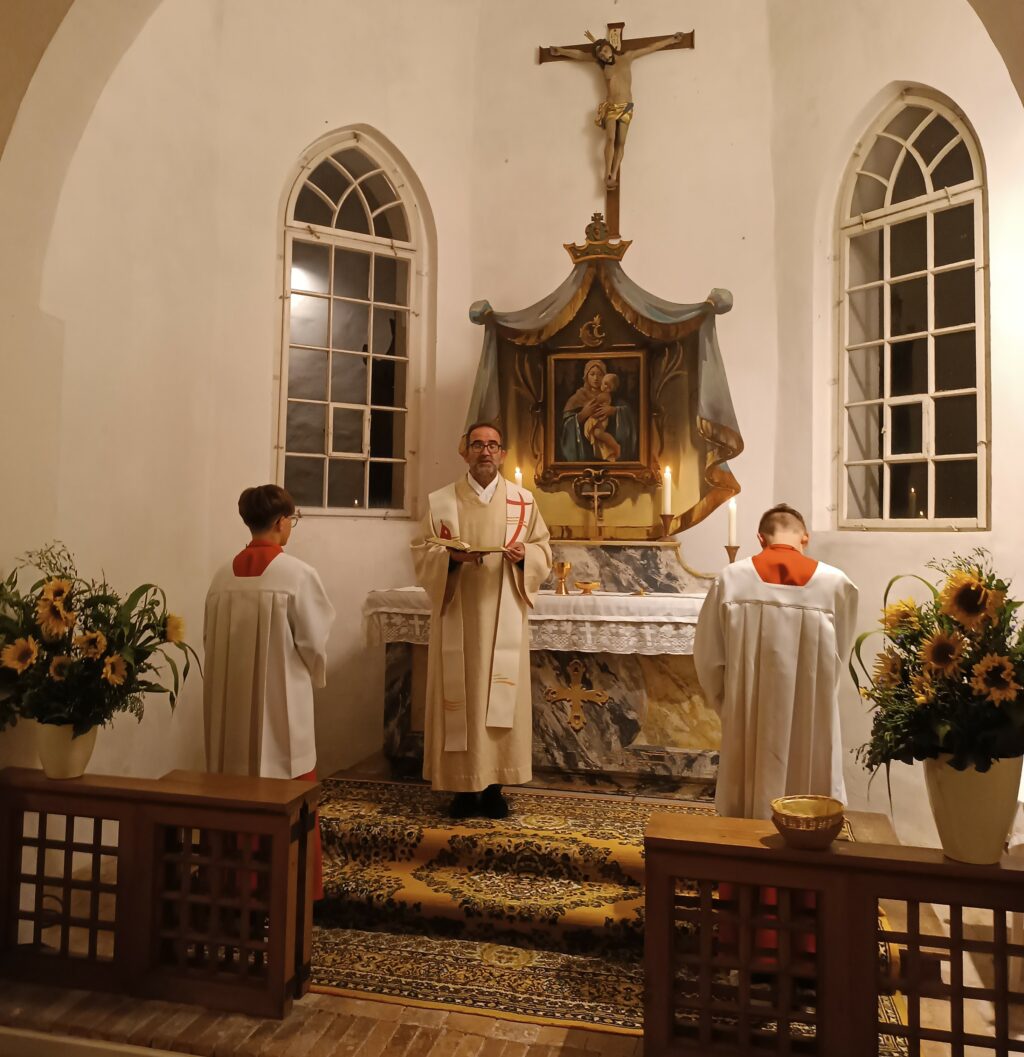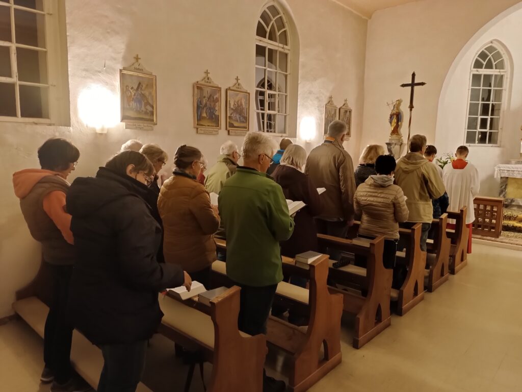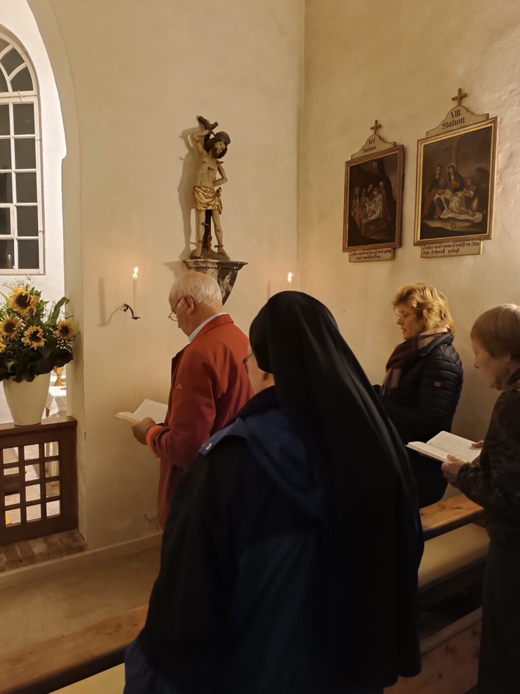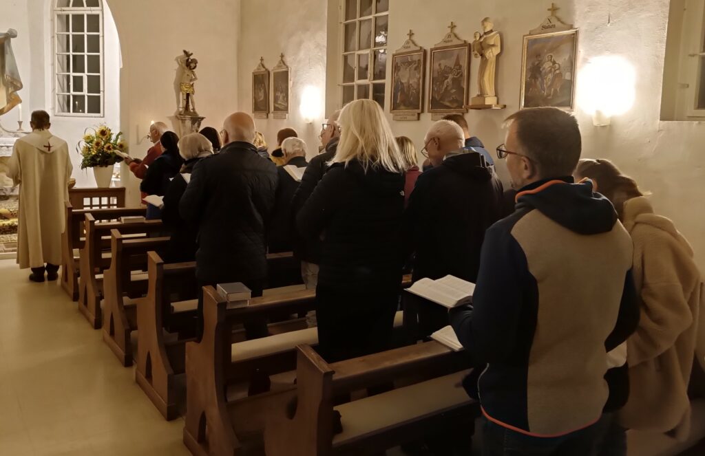 Knapp 40 Gläubige aus Kümmerazhofen, aber auch Gäste aus der Seelsorgeeinheit Bad Waldsee kamen am Mittwoch, 18. Oktober, zum Abendgottesdienst. Kapellenmesner Josef Schmid begrüßte nach dem gemeinsam gebeteten „Engel des Herrn“ die Besucher. Pfarrer Stefan Werner freute sich ob des zahlreichen Besuches, auch Gäste aus Weißenau, Bad Schussenried und Vorsee waren gekommen. Schwester Regina sprach neben der Lesung auch das Fürbittgebet.