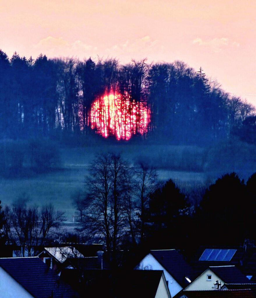 Haisterkirch – Eva Zitzl hat uns wieder ein Foto zukommen lassen. Titel: „Feuerball im Wald“. Gesehen am 1. März beim Spaziergang am Ortsrand von Haisterkirch, als die untergehende Sonne in Westen Richtung Bad Waldsee verschwand. Nachstehend das Bild.