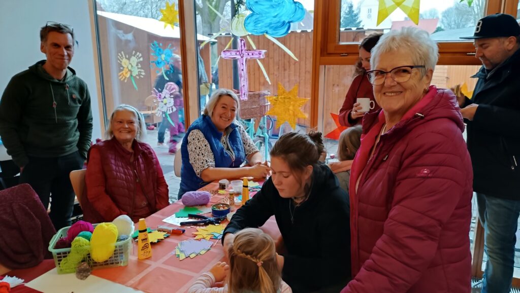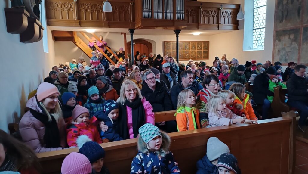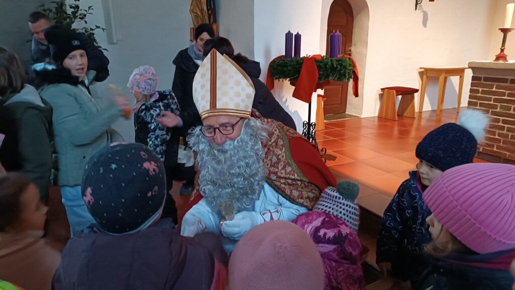 In der Leonhardskirche erfreute der heilige Nikolaus in Gestalt von Charlie Schmidberger etwa 100 Kinder mit seinem Besuch. Nach einer Tiergeschichte und der legendären Frage „Wart Ihr auch alle brav?“ verteilte er weit über 100 Geschenke. Nach einer vorschriftsmäßigen Ampelüberquerung der B 30 ging es schnurstracks wieder ins Dorfgemeinschaftshaus.