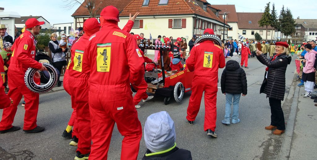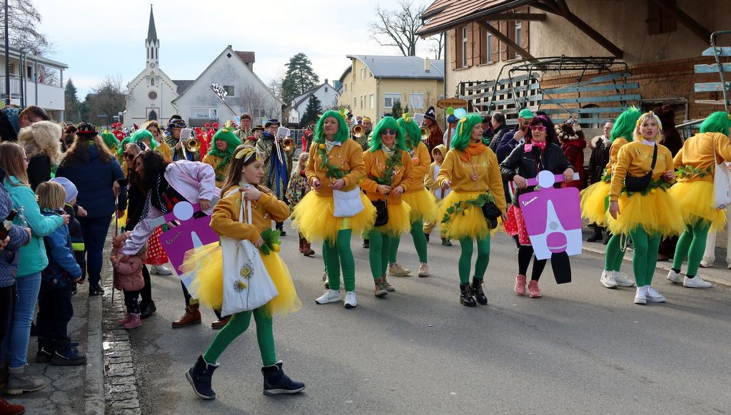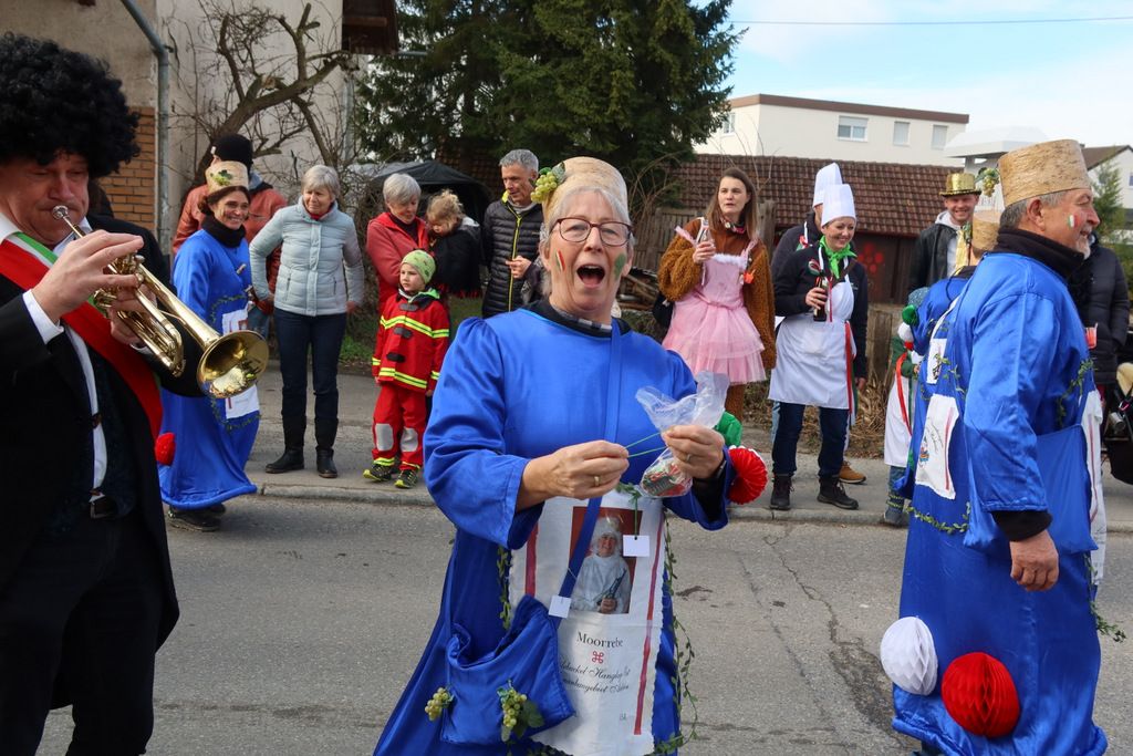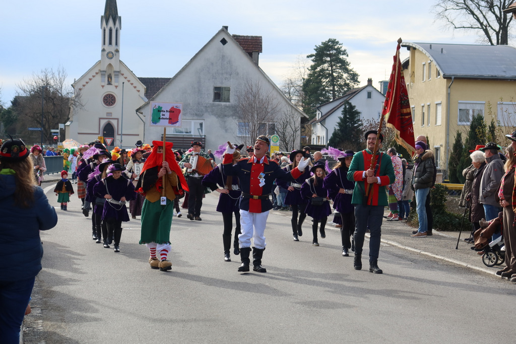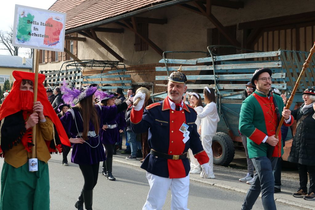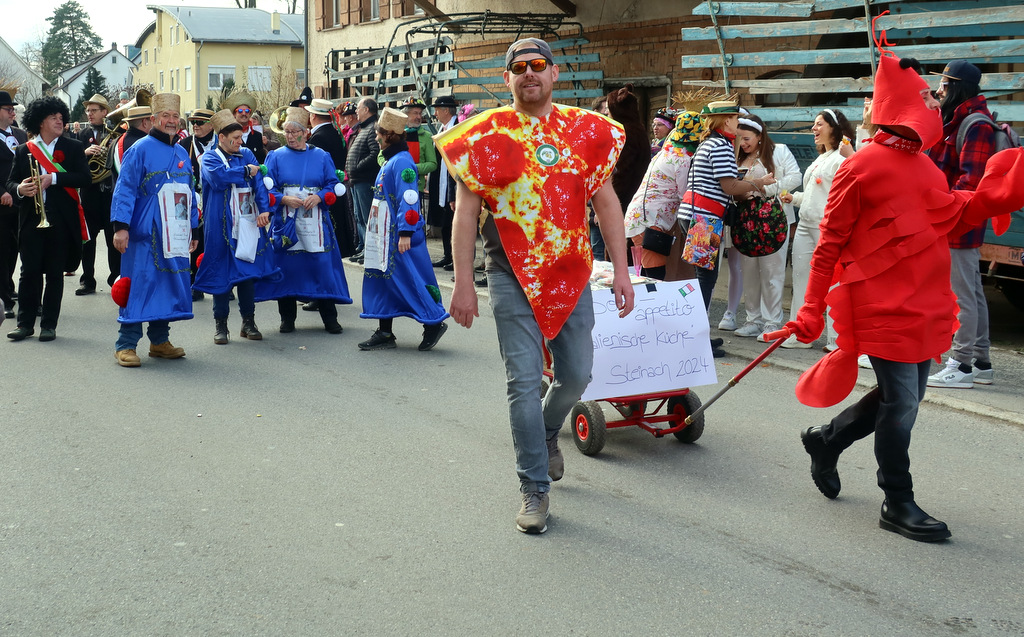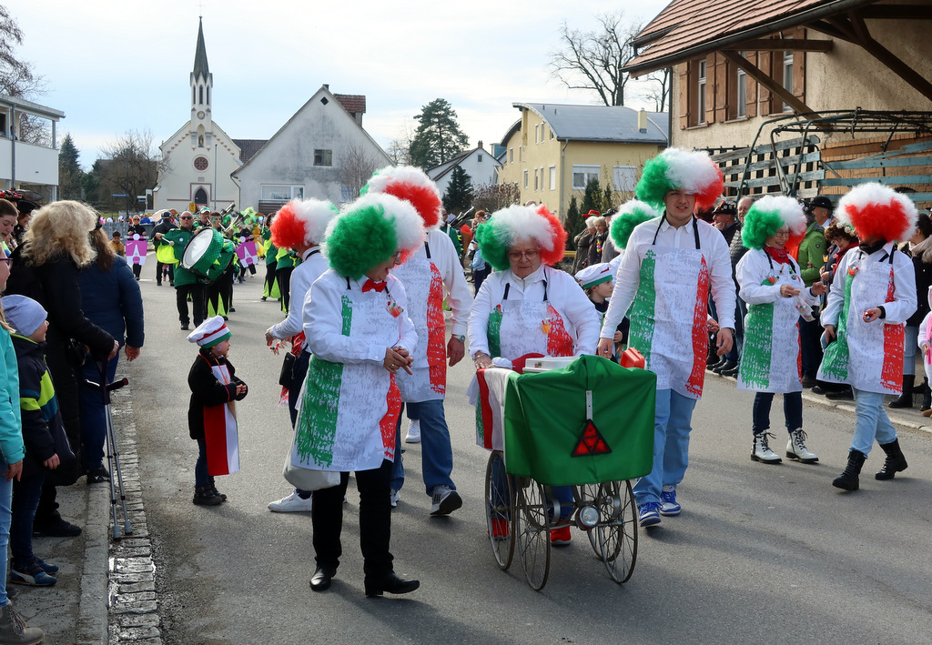 Angeführt wurde der närrische Umzug der „Achsteiner“ durch den Büttel Armin Sauter, gefolgt von den Steinacher Gardedamen. Die bunt gemischten Gruppen mit italienischem Outfit schwärmten aus und trieben ihren Schabernack mit den Zuschauern. Da waren Mafiosi dabei, genauso wie nett kostümierte mit Citrusfrüchten behängte Ausschenkerinnen von Aperol und Limoncello. Natürlich durften die Nationalfarben, wunderschön dargestellt in Grün-Weiß-Rot Trikolore-Kostümierungen nicht fehlen. Auch spezielle Vesperangebote mit italienischen Pizza-Nationalgerichten wie auch Parma-Schinken machten „Buon appetito“ zum Leitwort.