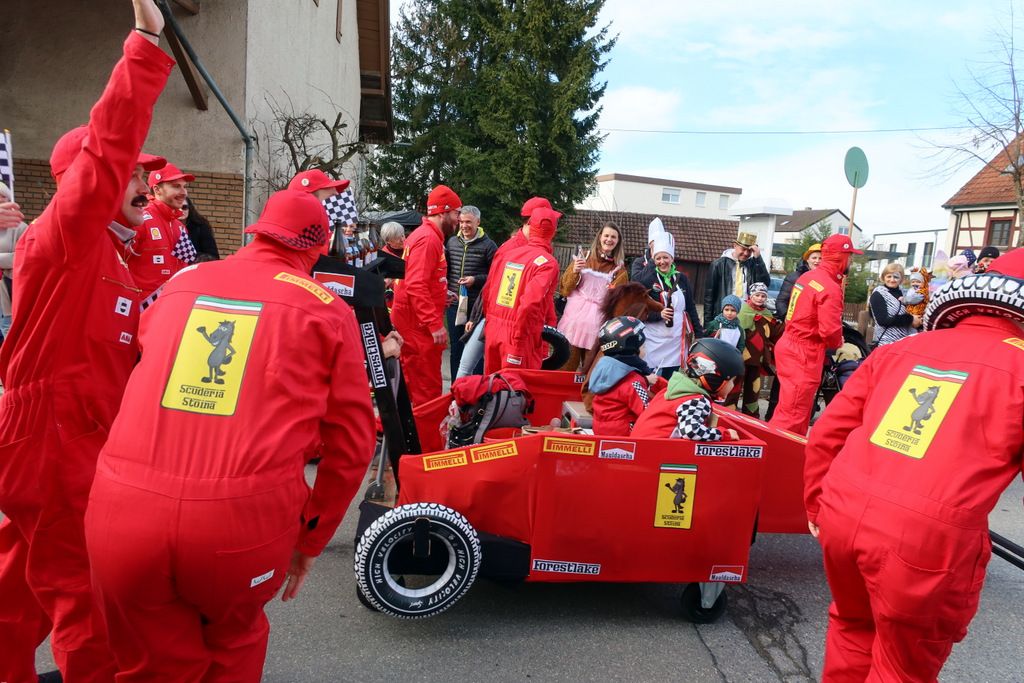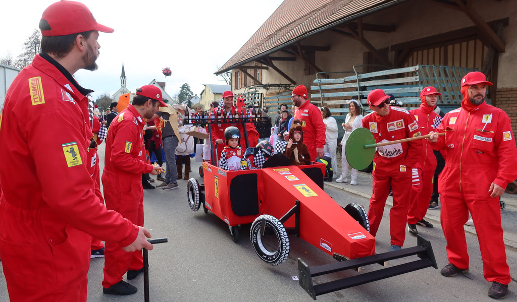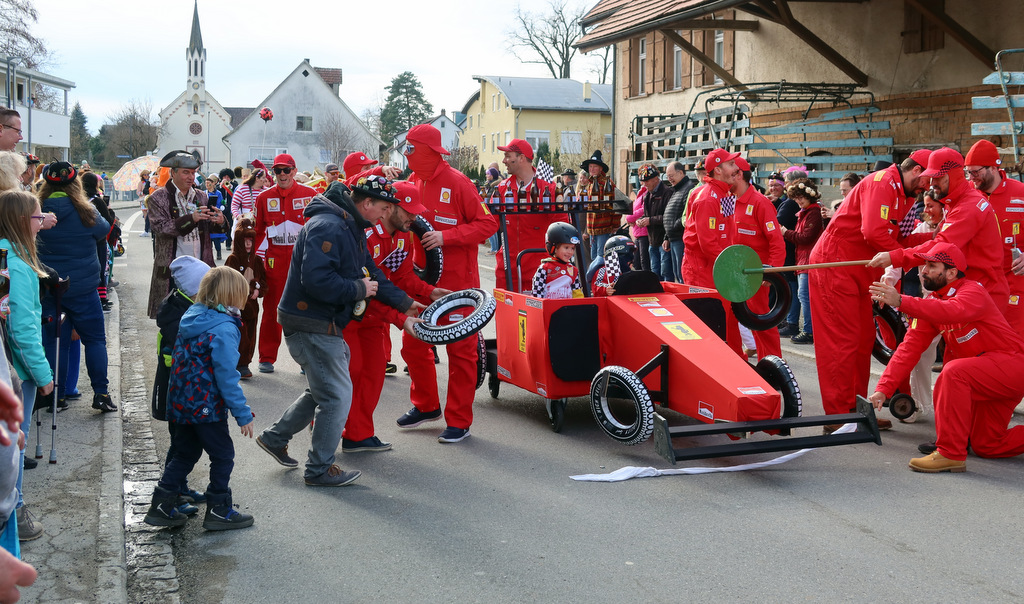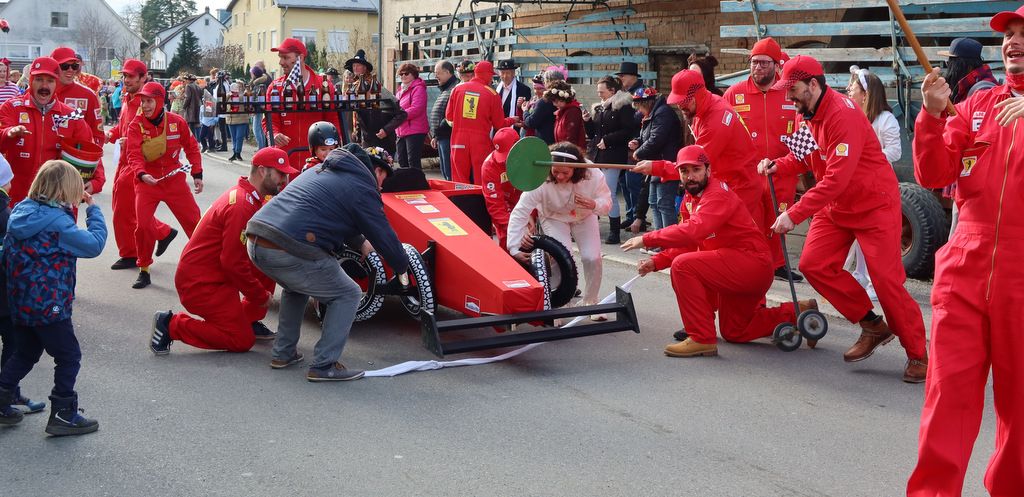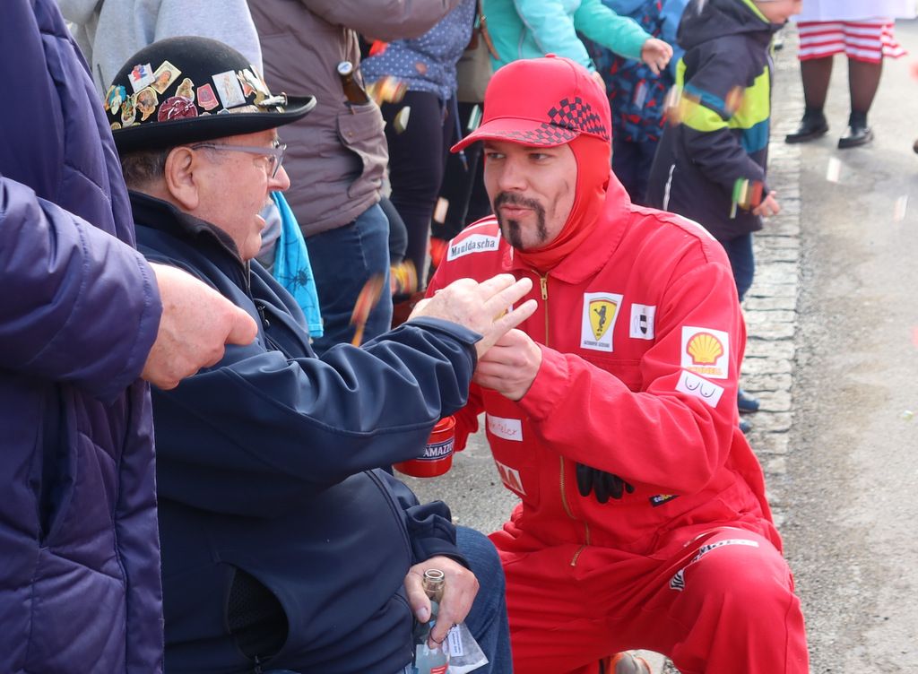Weltweit bekannt ist der Ferrari-Rennstall, der mit der „Scudera-Stoina“ in Steinach zu Gast war und bei Boxenstopps mit viel Reifenwechsel für gewaltiges Aufsehen sorgte. Genauso bekannt ist im motorisierten Zweiradbereich das Markenprodukt „Vespa“. Auf ihren Motorrollern belebten feurige Vespa-Verehrerinnen das Umzugsgeschehen.