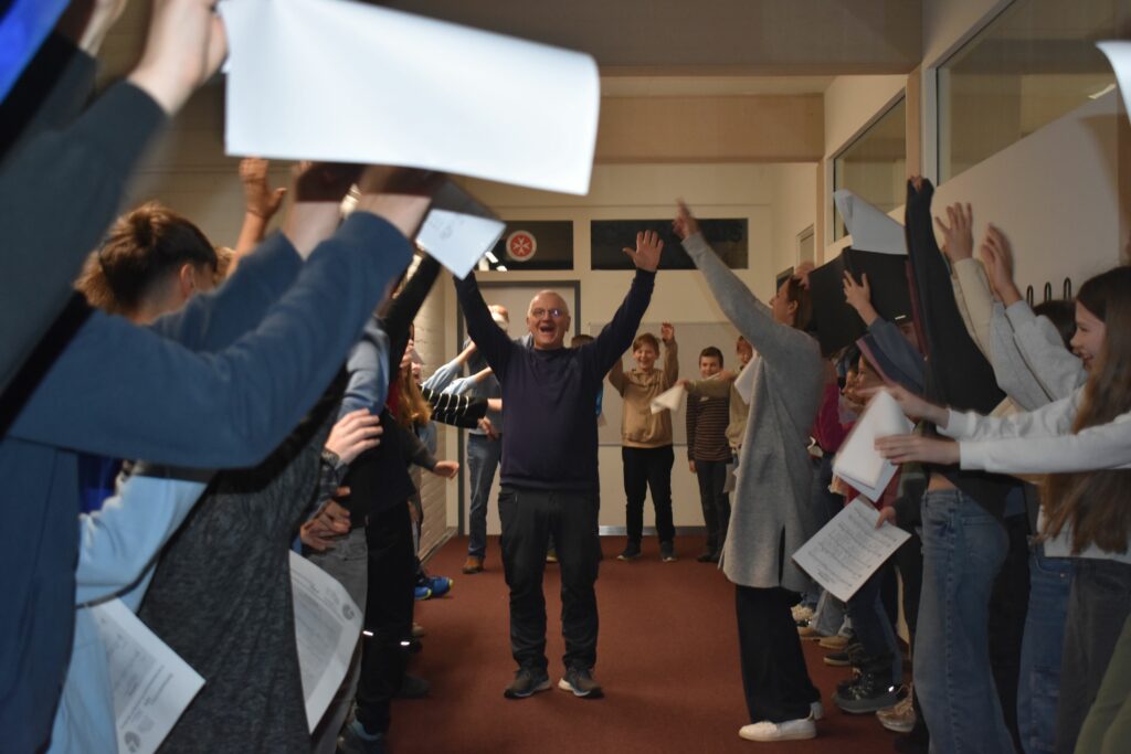 Wie die wenigen Sekretärinnen im Haus seit Beginn, sei auch Herr Föll einer der Garanten für Stabilität, so Schulleiter Mark Overhage bei der Verabschiedung durch die Schulgemeinschaft. Beeindruckende Zahlen. Der Hausmeister selbst genoss seinen vorletzten Dienst-Tag, denn heute, am 28. November, klatschte er während der Spalier-Runde fast die Hände der gesamten Schülerschaft zum Abschied ab, bekam zahlreichen Applaus, ihn würdigende Reden und Aufmerksamkeiten von Schulleiter Mark Overhage sowie den Schülersprecherinnen, Mia und Evelyn, einen Orchesterbeitrag sowie den Schulsong präsentiert. Das volle Programm! Auch Herr Heine, der im Namen der gesamten Verwaltung Herrn Föll dankte und der Verabschiedung beiwohnte, hielt eine Rede und erinnerte unter anderem an Zeiten, als Günther Föll noch abends eine Extrarunde mit dem damaligen Wachhund drehte und sich so intensiv um das Zentrum auf dem Döchtbühl bemühte; als „Auge des Campus“ sozusagen.