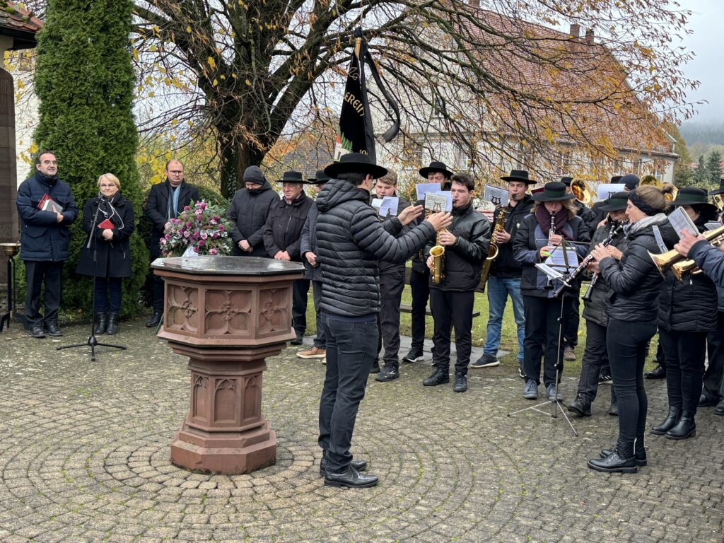 Überwiegend ältere Menshen wohnten der öffentlichen Gedenkfeier im Rahmen des staatlich angeordneten Volkstrauertags bei. Vor der Kriegsopfer-Gedenkstätte hatten Musikerinnen und Musiker des Musikvereins Haisterkirch ihre festen Plätze eingenommen. Dass so viele nach dem anstrengenden Jahreskonzert am Vortag gekommen waren, ist besonders beachtens- und lobenswert.