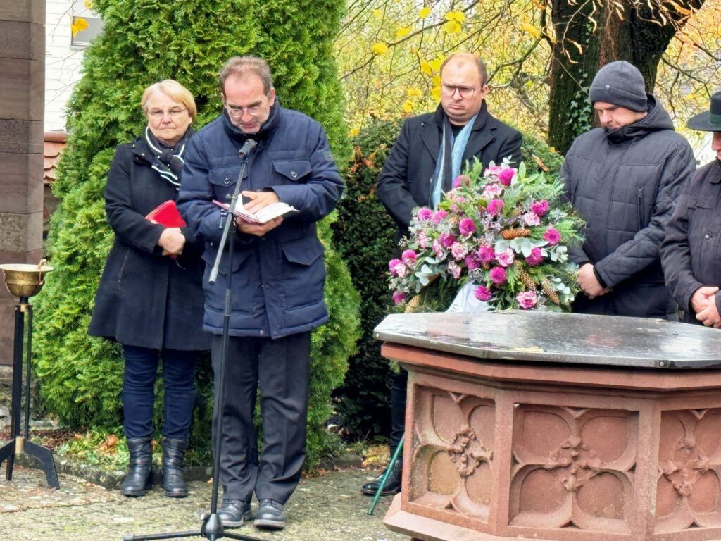 Haisterkirch – Regnerisch, kalt und windig war es am Sonntagmorgen auf dem Vorplatz der Kirche St. Johannes Baptist in Haisterkircht. Hier hatten sich Mitbürgerinnen und Mitbürger nach dem sonntäglichen Gottesdienst, den Pfarrer Stefan Werner geleitet hatte, zum Gedenken anlässlich des Volkstrauertages versammelt.