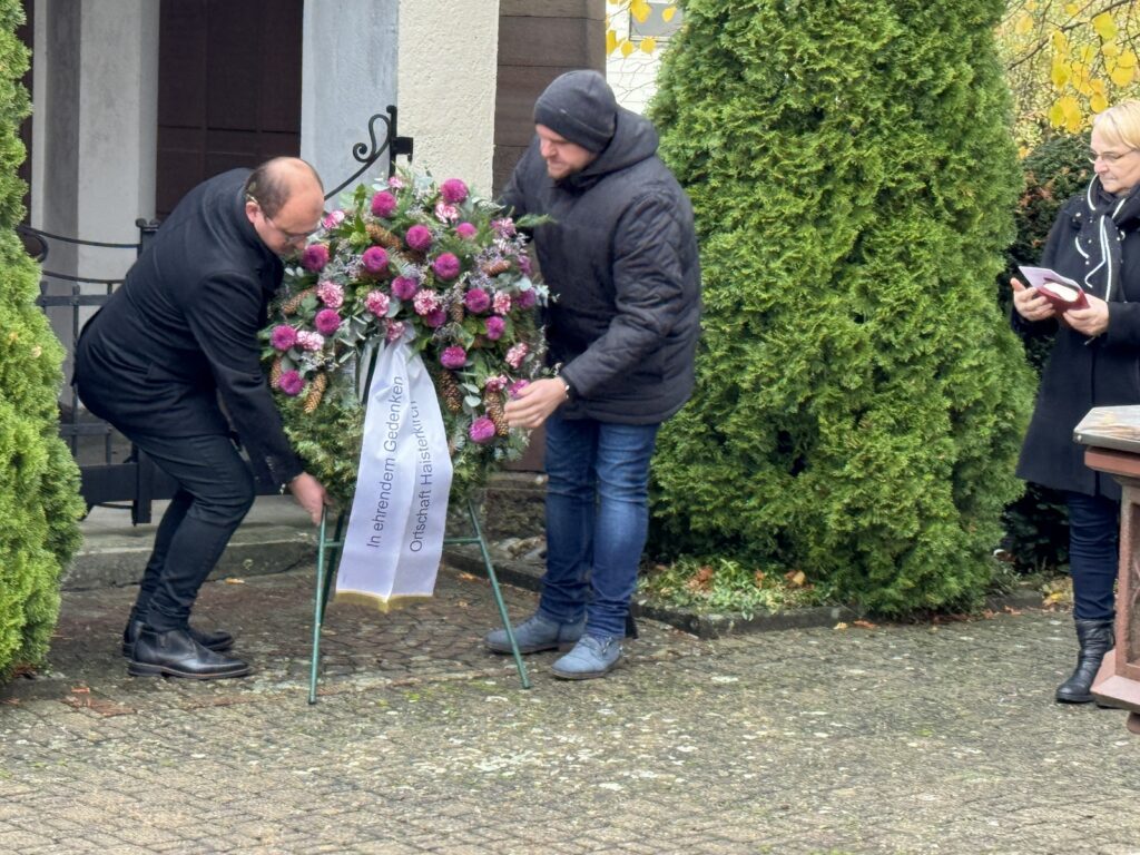 Die Musikkapelle Haisterkirch unter Leitung von Daniel Maucher intonierte zu Beginn der Gedenkveranstaltung Choralweisen und zum Ende der Gedenkfeier das Lied „Ich hatt´ einen Kameraden“, während zwei Angehörige des Ortschaftsrats (Markus Bohner und Matthias Covic) das Trauergebinde der Ortschaft vor der Kriegsopfer-Gedenkstätte niederlegten.