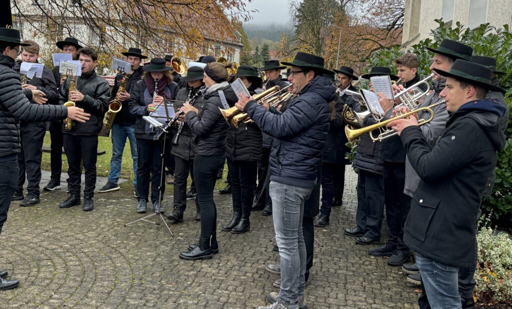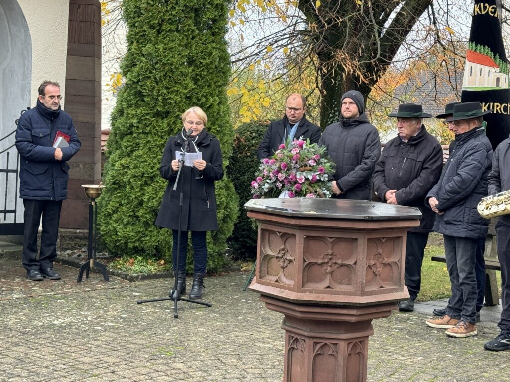 Rosa Eisele bat dann um einen Spendenbeitrag für den Volksbund Deutscher Kriegsgräberfürsorge. Ein besonderes Dankeschön richtete sie an Pfarrer Stefan Werner und an die Musikkapelle Haisterkirch. Die Musikanten und ihr Dirigent Daniel Maucher waren trotz ungünstiger Witterung und der Anforderungen des am Abend zuvor stattgefundenen Jahreskonzerts in großer Besetzung zur Gedenkfeier gekommen.