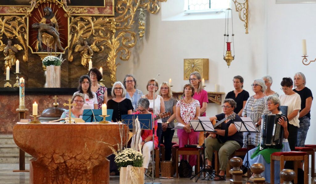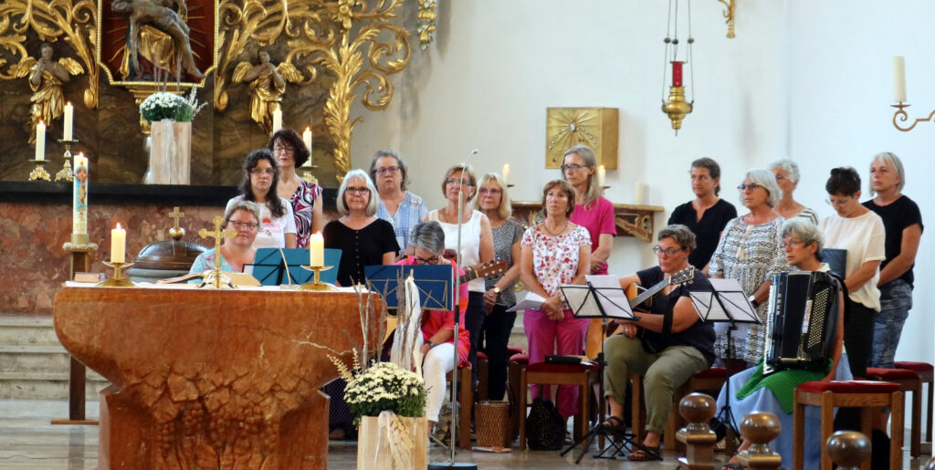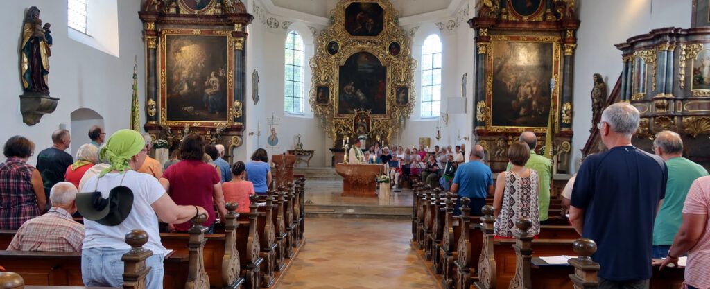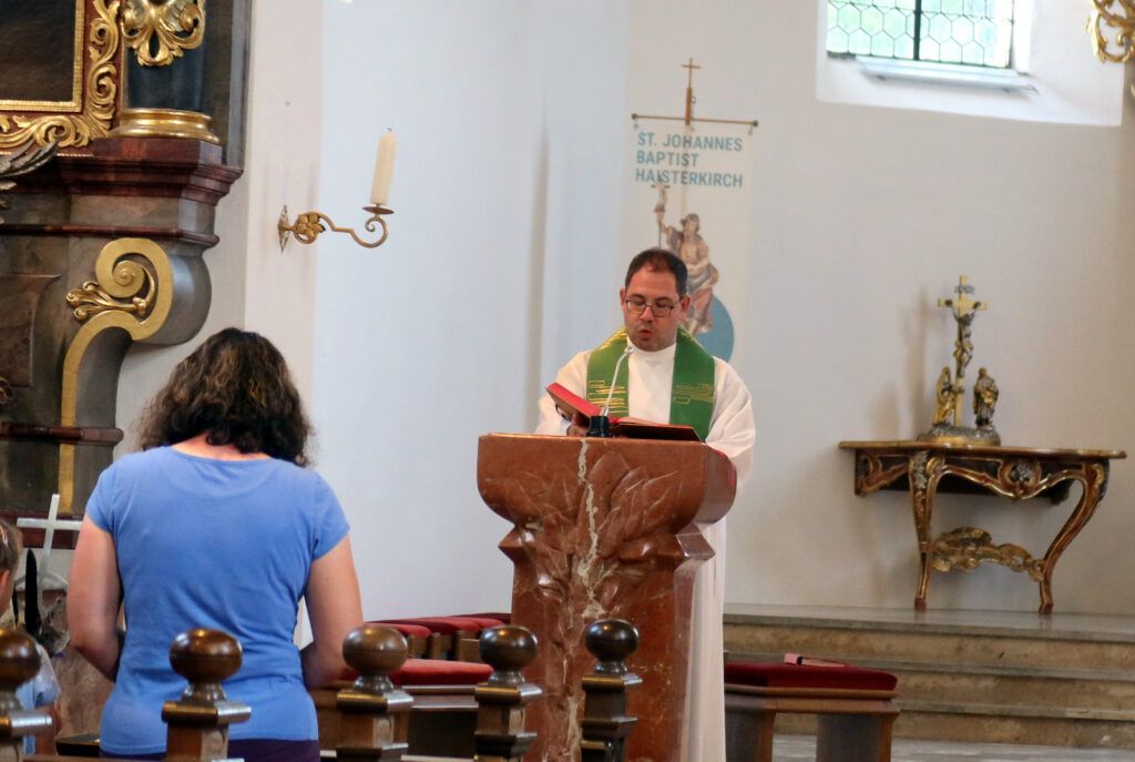 Traditionell wird der Pilgerschar seit Jahren schon in der Haisterkircher Gemeindehalle dank der Vermittlung durch die Ortschaftsverwaltung und Kirchengemeinde eine willkommene Übernachtungsmöglichkeit angeboten. Die Gruppe besuchte auf ihrer Wanderung durch Oberschwaben auch die Kapelle St. Sebastian und am Abend zelebrierte Pfarrer Ingo Kuhbach aus Mulfingen – er ist auch Dekan des Dekanats Hohenlohe – in der Haisterkircher Pfarrkirche St. Johannes Baptist eine Eucharistiefeier. Dieser besondere Gottesdienst wurde musikalisch sehr feierlich umrahmt vom Sing-und Instrumentalkreis Haisterkirch. Gekommen zum Gottesdienst waren die Pilgerinnen und Pilger mit ihren Fahnen- Abordnungen. Das Liedgut war sinnigerweise abgestimmt auf die Pilgergruppe mit Liedern wie „Möge die Straße uns zusammenführen“ oder auch „Du bist da, wo Friede ist“. Inbrünstig wurde im Kanon „Herr gib uns Deinen Frieden“ gemeinsam gesungen.