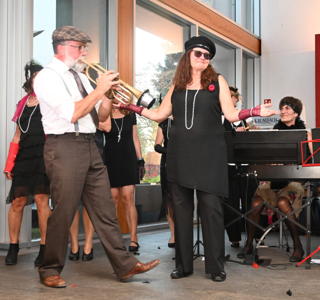 Das Golf-Resort unter Leitung von Sascha Binoth hatte ein unterhaltsames Rahmenprogramm organisiert. Die sieben jungen Damen der Showtanzgruppe der Narrenzunft Bad Schussenried wirbelten im Stil der 20er durch das Foyer und der Frauenchor „InTakt“ aus Bergatreute bot gekonnt Musik der 20er- und 30er-Jahre dar wie zum Beispiel Marlene Dietrichs berühmtes Lied „Ich bin von Kopf bis Fuß auf Liebe eingestellt“ aus dem Film „Der blaue Engel“.