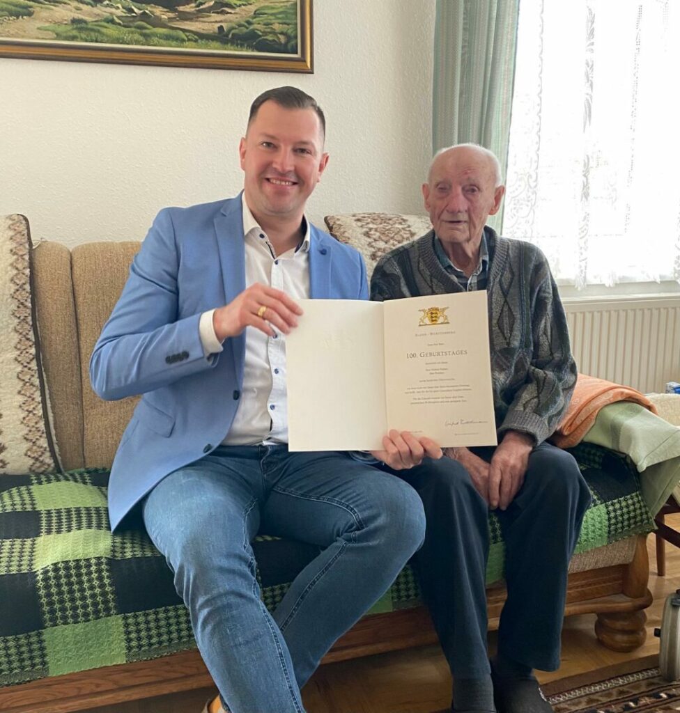 Zu diesem besonderen Festtag gratulierte Oberbürgermeister Matthias Henne nach den Osterfeiertagen ganz herzlich und überreichte dem Jubilar einen Geschenkkorb sowie Glückwunsch-Urkunden der Stadt und des Ministerpräsidenten Winfried Kretschmann.