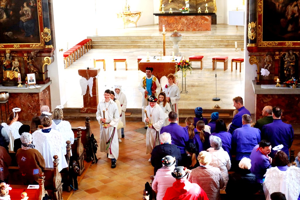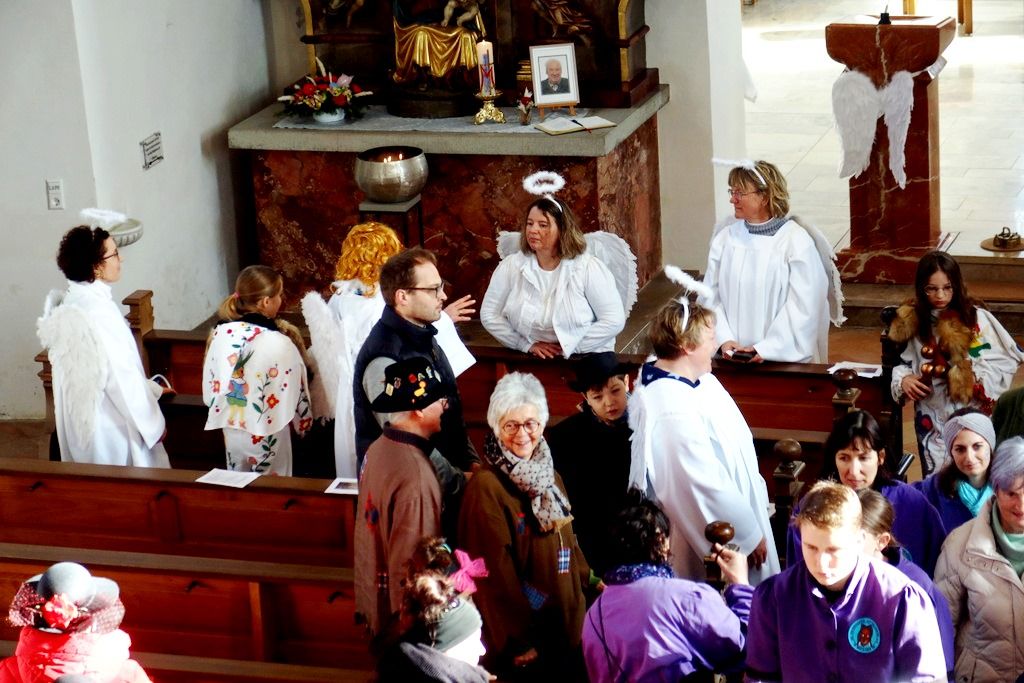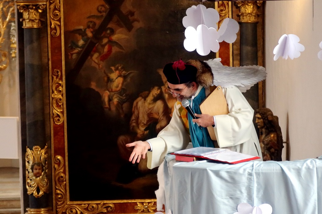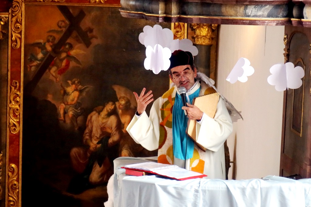 Die Eucharistiefeier steht dabei jeweils unter einem besonderen Leitthema, das sich auf erklärende Weise auf das Wirken Jesu befasst. Dieses Mal wurde das Motto „Auch Du kannst ein Engel sein“ facettenreich sehr anschaulich durch symbolische Zeichen und Deutungen versinnbildlicht. Im Engelsgewand waren fleißige Mitarbeiterinnen zum Gottesdienst gekommen. Selbst Pfarrer Stefan Werner, der die Eucharistiefeier zelebrierte, hatte sich auf der himmlisch dekorierten Kanzel ebenfalls Engelsflügel umgebunden.