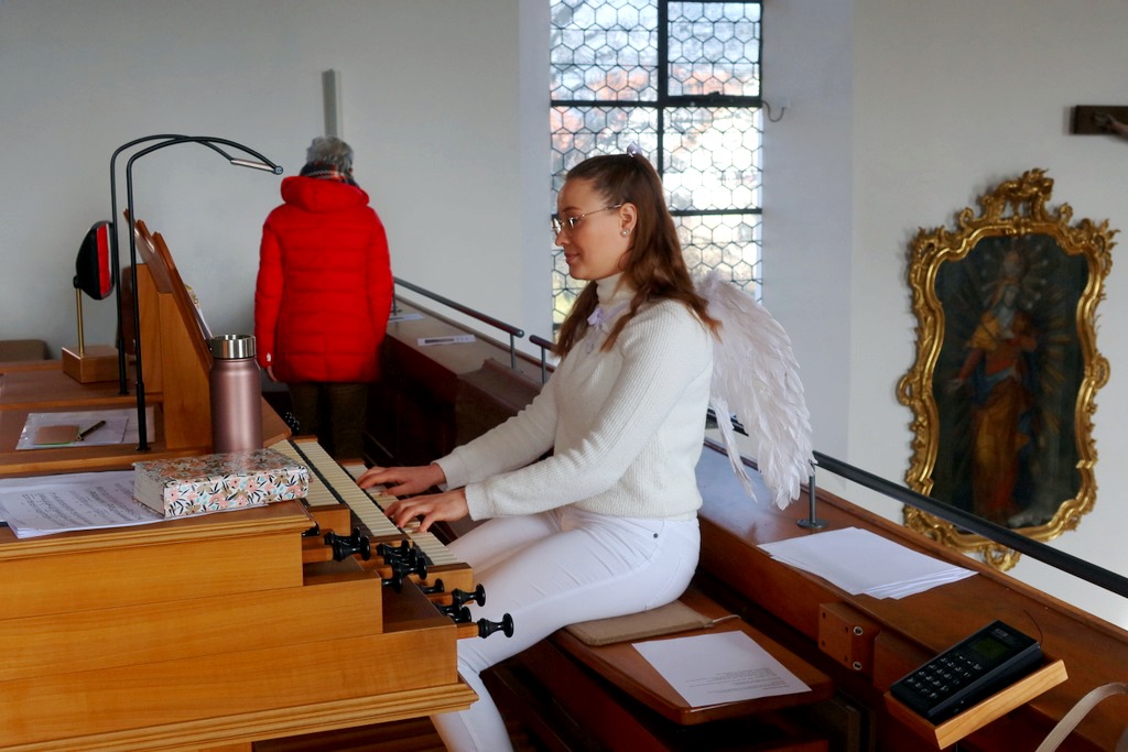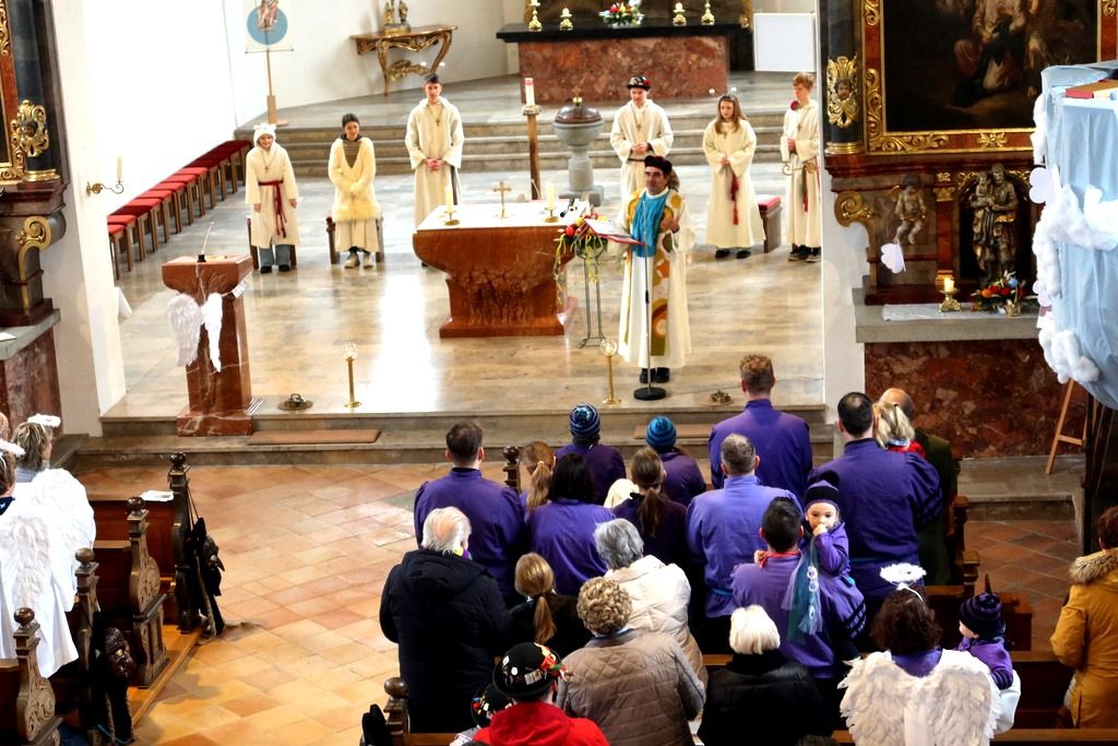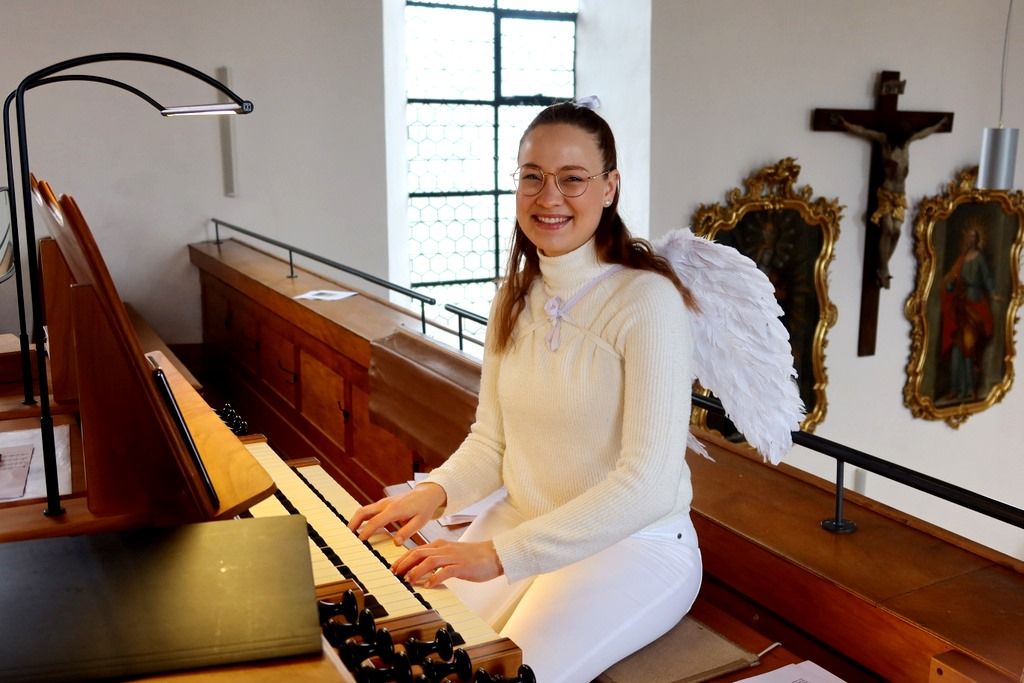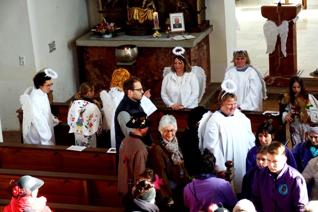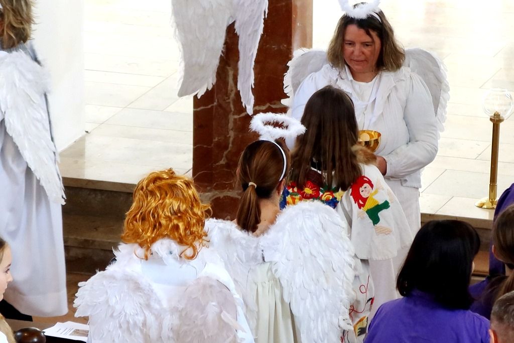 Die Eucharistiefeier steht dabei jeweils unter einem besonderen Leitthema, das sich auf erklärende Weise auf das Wirken Jesu befasst. Dieses Mal wurde das Motto „Auch Du kannst ein Engel sein“ facettenreich sehr anschaulich durch symbolische Zeichen und Deutungen versinnbildlicht. Im Engelsgewand waren fleißige Mitarbeiterinnen zum Gottesdienst gekommen. Selbst Pfarrer Stefan Werner, der die Eucharistiefeier zelebrierte, hatte sich auf der himmlisch dekorierten Kanzel ebenfalls Engelsflügel umgebunden.