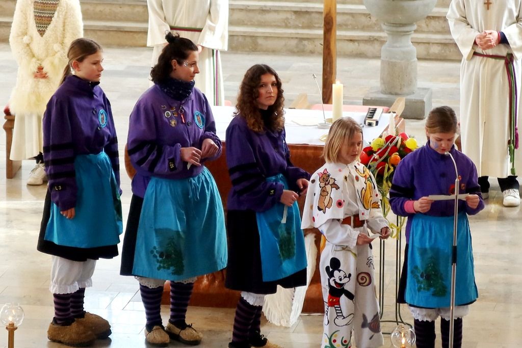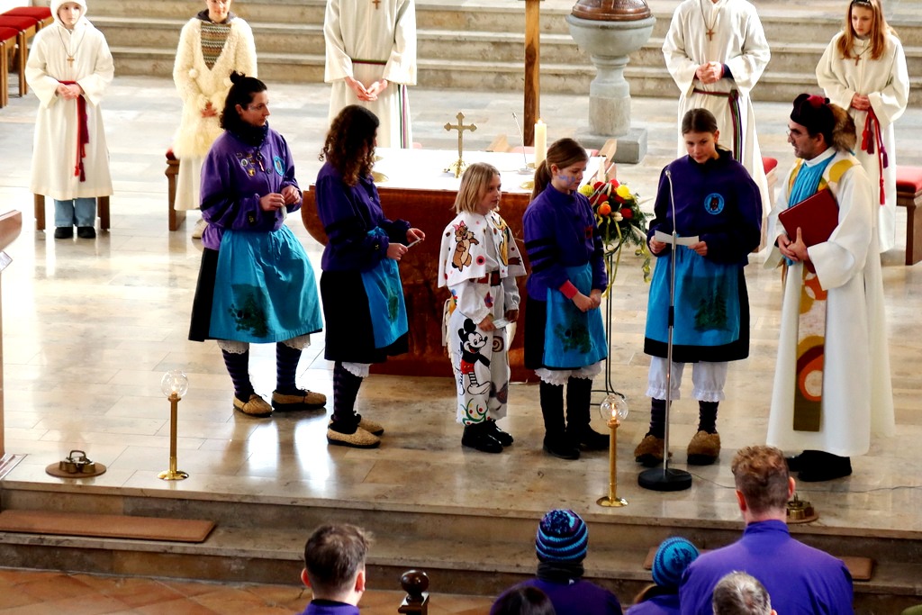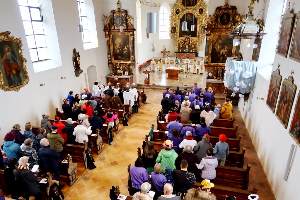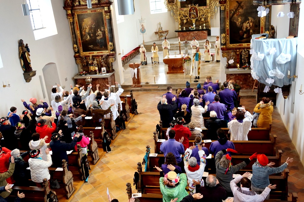 Auch dieses Mal konnte er nach gewohnt intensiver Vorbereitung auf diese Messfeier viele Unterstützerinnen und Unterstützer für eine freudvolle Gestaltung des Familiengottesdienstes gewinnen und einbeziehen. Auch eine stattliche Abordnung der Narrenzunft Osterhofen-Hittelkofen („Waldhex“) mit großen und kleinen Närrinnen und Narren hatte sich eingefunden und war bei den Fürbittgebeten aktiv dabei. Nicht nur die Ministrantenschar, etliche Kinder und natürlich auch die Waldhexen waren fastnächtlich gekleidet. Auch etliche der zahlreichen Gottesdienstbesucher hatten für närrisches Äußeres gesorgt.