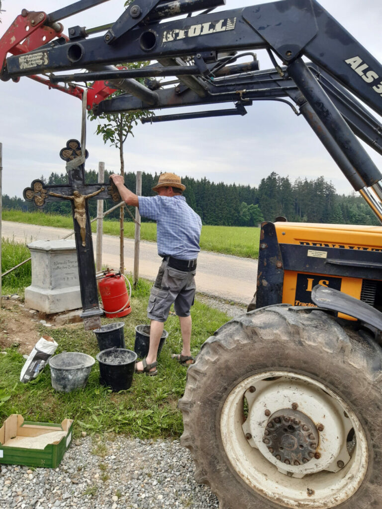 Für die Wiedererrichtung des Kreuzes nach der zweiten Freveltat hatte sich eine damals noch aktive Haisterkircher Fasnetsgruppe mit einer Geldspende starkgemacht. Damit war für die Reparatur gesorgt worden und das sakrale Kleindenkmal konnte im Herbst 2002 wieder an seinem angestammten, noch heutigen Platz errichtet werden. Seither gab es erfreulicherweise keine Zerstörungen mehr. Aber der Zahn der Zeit nagte inzwischen doch gewaltig am Sockel des Kleinods. Dieser war total vermoost und die Inschrift konnte nur noch mühevoll entziffert werden. Das brachte den Grabener Bürger Erwin Fink auf die Idee, hier tatkräftig ans Werk zu gehen. Er bat seinen Nachbarn Karl Dangel, der die notwendigen technischen Geräte besitzt, um Mithilfe beim Einbetonieren des Sockels, der zuvor fein säuberlich gesäubert worden war.