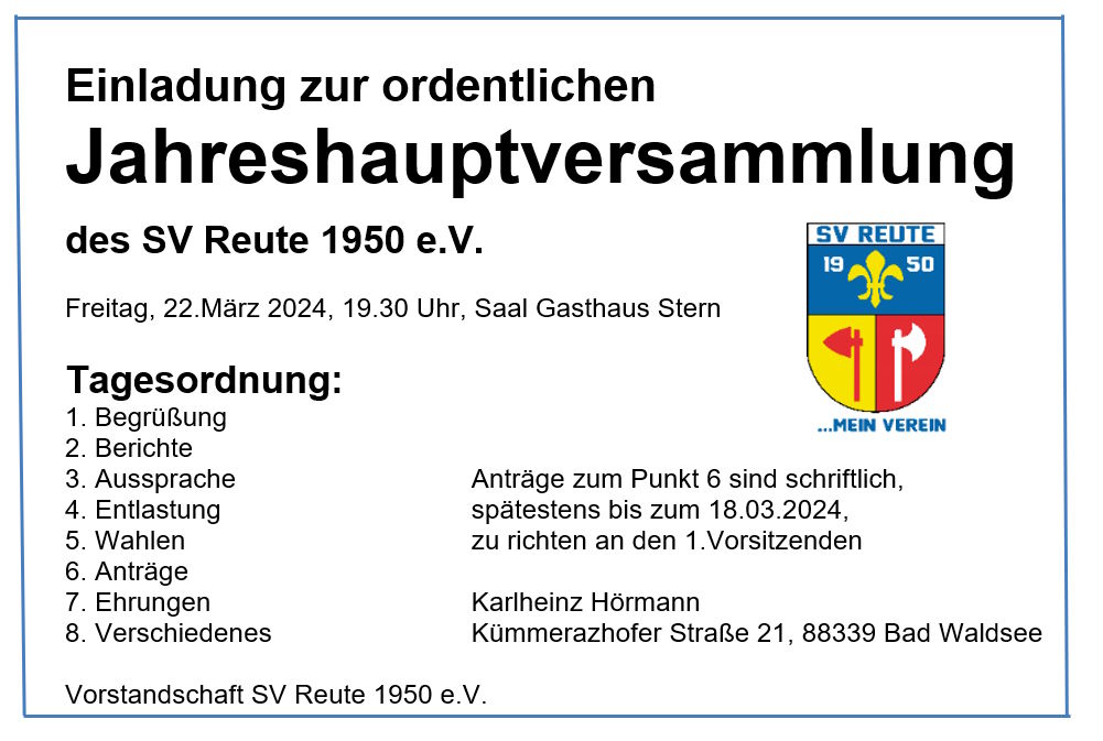 Reute – Der SV Reute 1950 e.V. lädt alle Mitglieder, Anhänger, Förderer, Freunde und sonstigen Interessierten zu seiner ordentlichen Jahreshauptversammlung am 22. März ins Gasthaus „Stern“ (Saal) ein. Nachstehend die Tagesordnung: