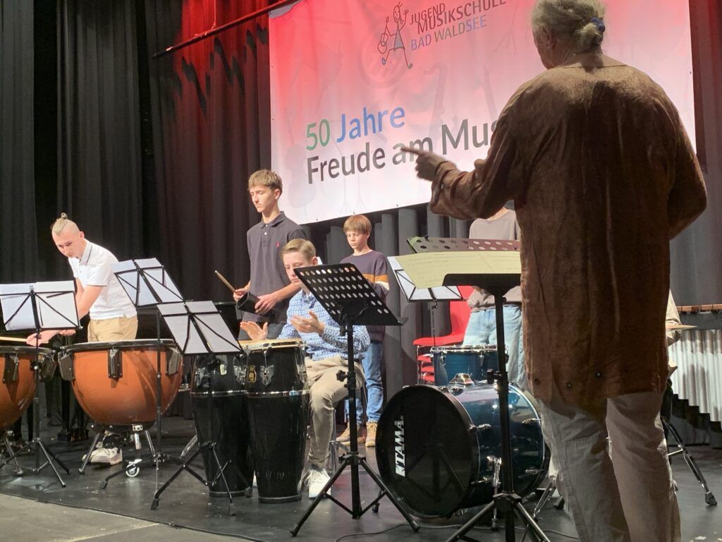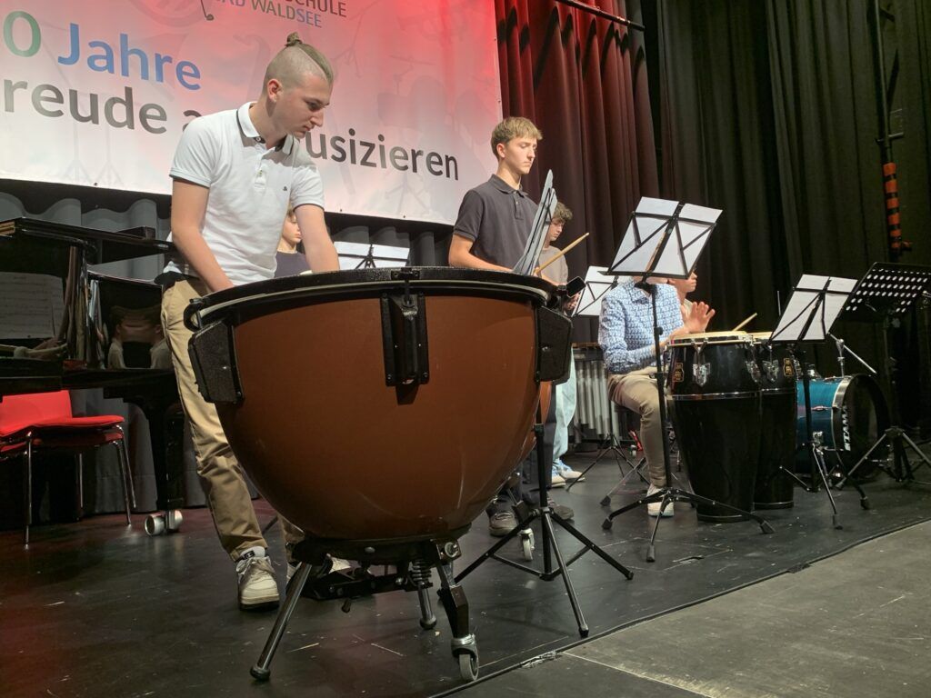 Den Schluss des Konzerts gestaltete Ralle Fricker mit „The Funky Timp’s“ von J.J. Cortijo. Die Percussionisten Jonas Frickel, Tim Schaz, Hannes Schlayer, Marc Schiller, Pascal Rebmann und Lukas Maucher zauberten mitreißende Rhythmen, auch unter Einsatz ihrer Stimmen auf die Bühne, wahrlich ein gelungener Schlusspunkt des Jubiläumsabends der Jugendmusikschule Bad Waldsee!