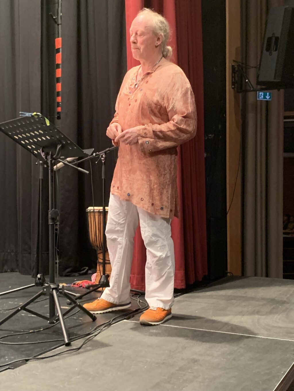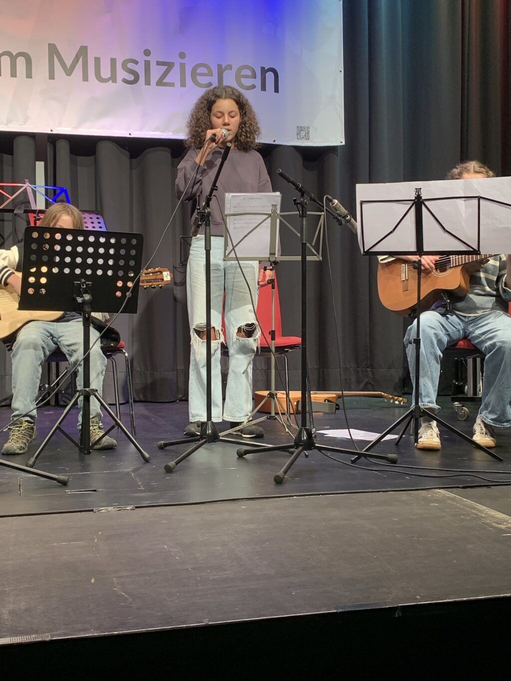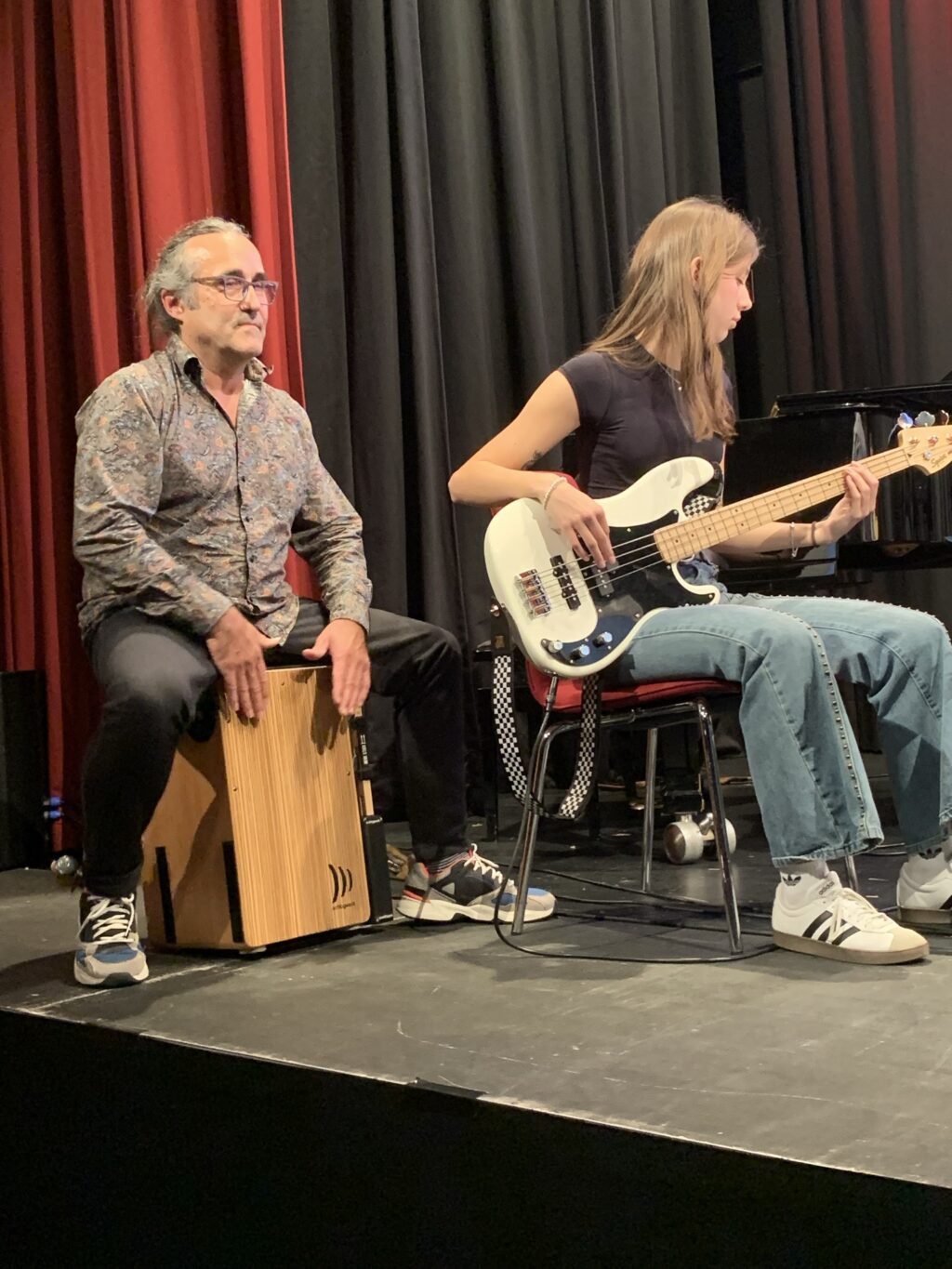 Das musikalische Programm wurde von Jens Richters Gitarrenklasse fortgesetzt unter dem Motto, „Barock meets Rock“. Acht junge Gitarrenschüler spielten sichtlich begeistert „Fiesta“ von R. Lenz, „Bouree“ von G. F. Händel, „Song Tune“ und „Je ne parle pas français“ von Namika und wurden teilweise von ihrem Lehrer am Cajon und mit Fußglocken begleitet.