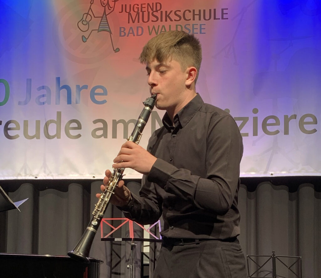 Der inzwischen mehrfach ausgezeichnete Klarinettenschüler Greg Oberhofer von Christine Zimmermann wagte sich an das sehr anspruchsvolle Stück „Solo de Concours‘ von Henri Rabaud. Schwierigste Läufe und der häufige Wechsel von Piano nach Forte und umgekehrt gelangen ihm hervorragend.